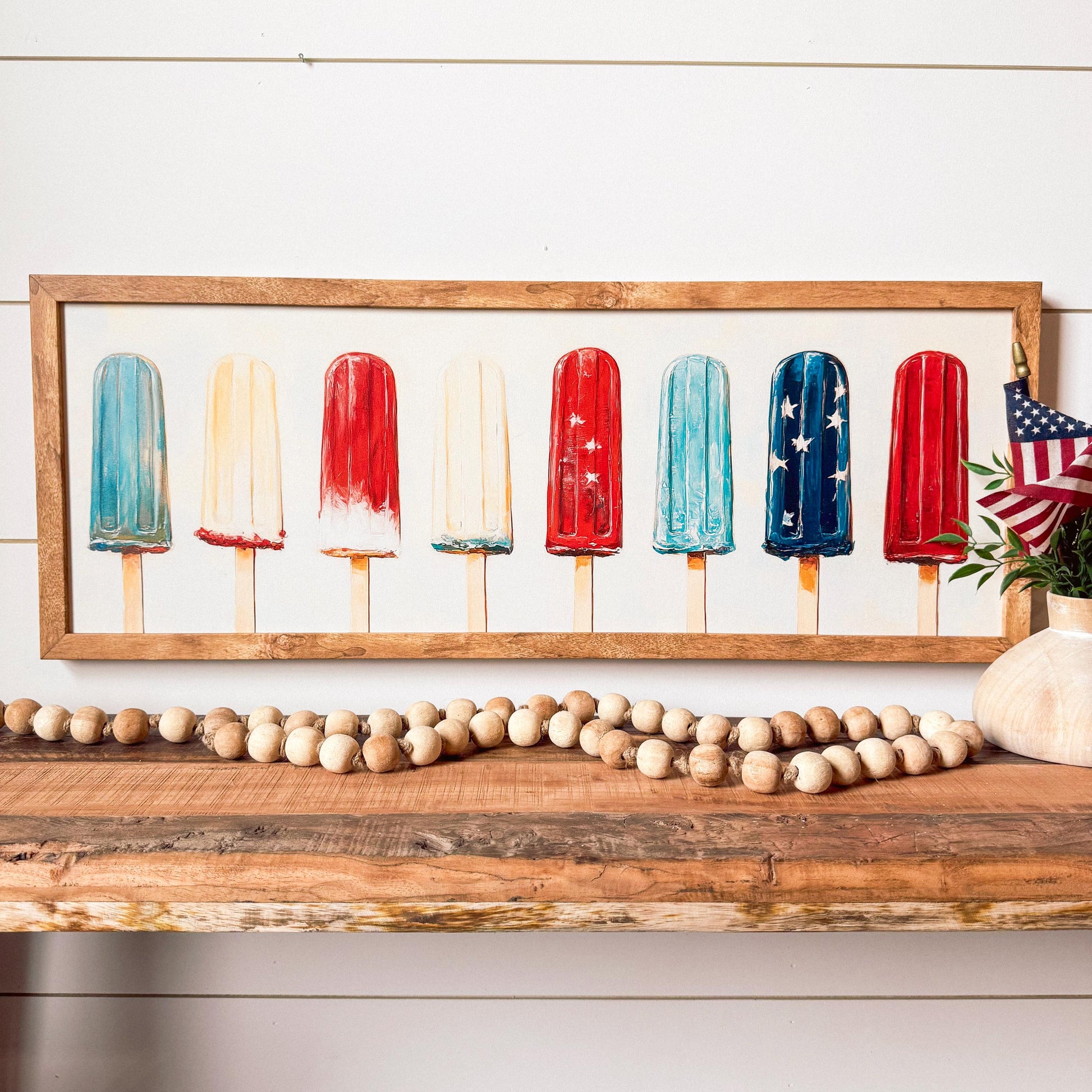 Handmade wooden sign with fun and festive row of popsicles with vintage style background. 4th of July themed and printed directly on wood and framed in the frame color of your choice. Perfect to add to your 4th of July and summer decor and to layer with other pieces.