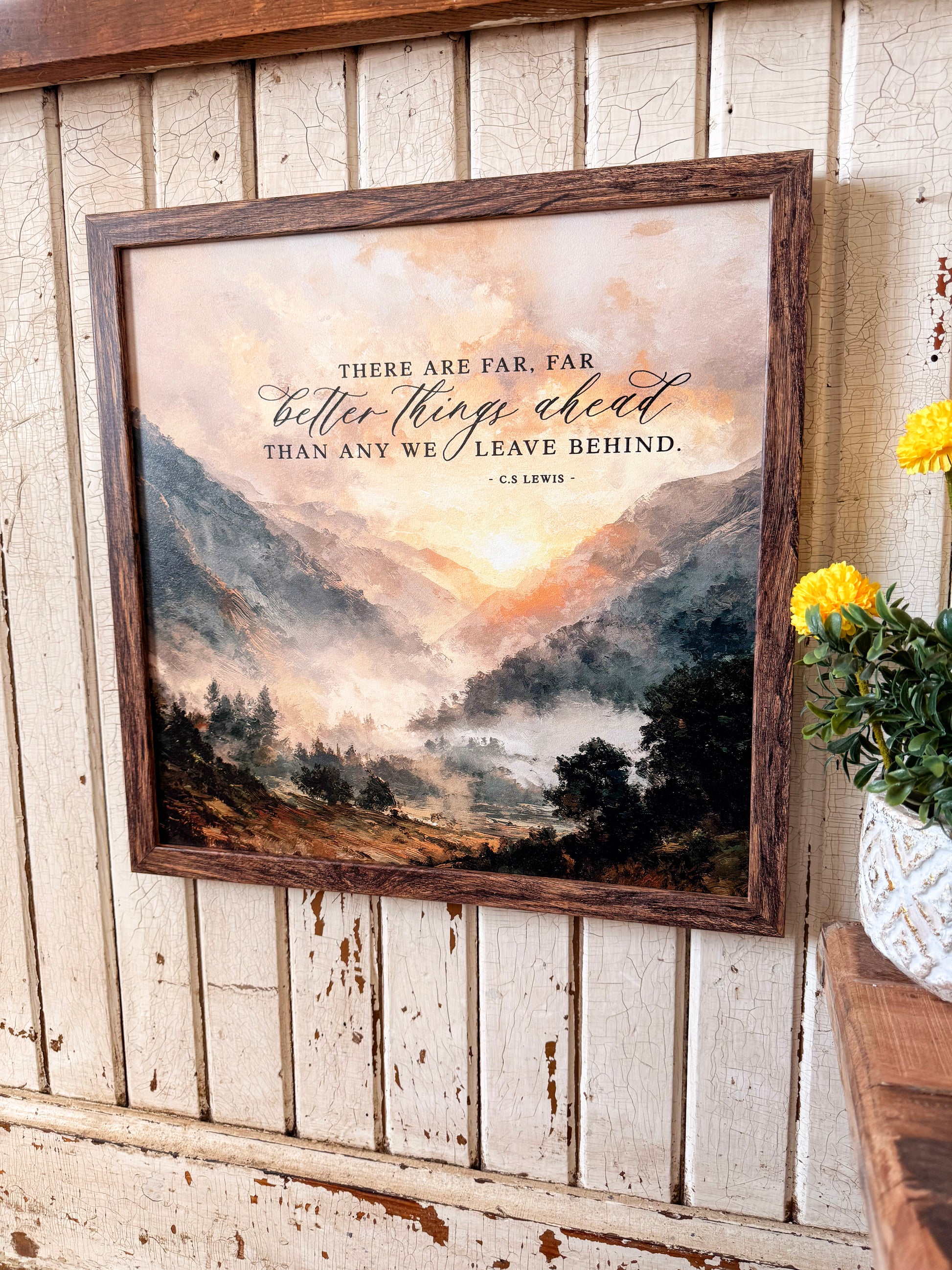 Better Things Ahead Quote with Mountain Landscape Wood Sign