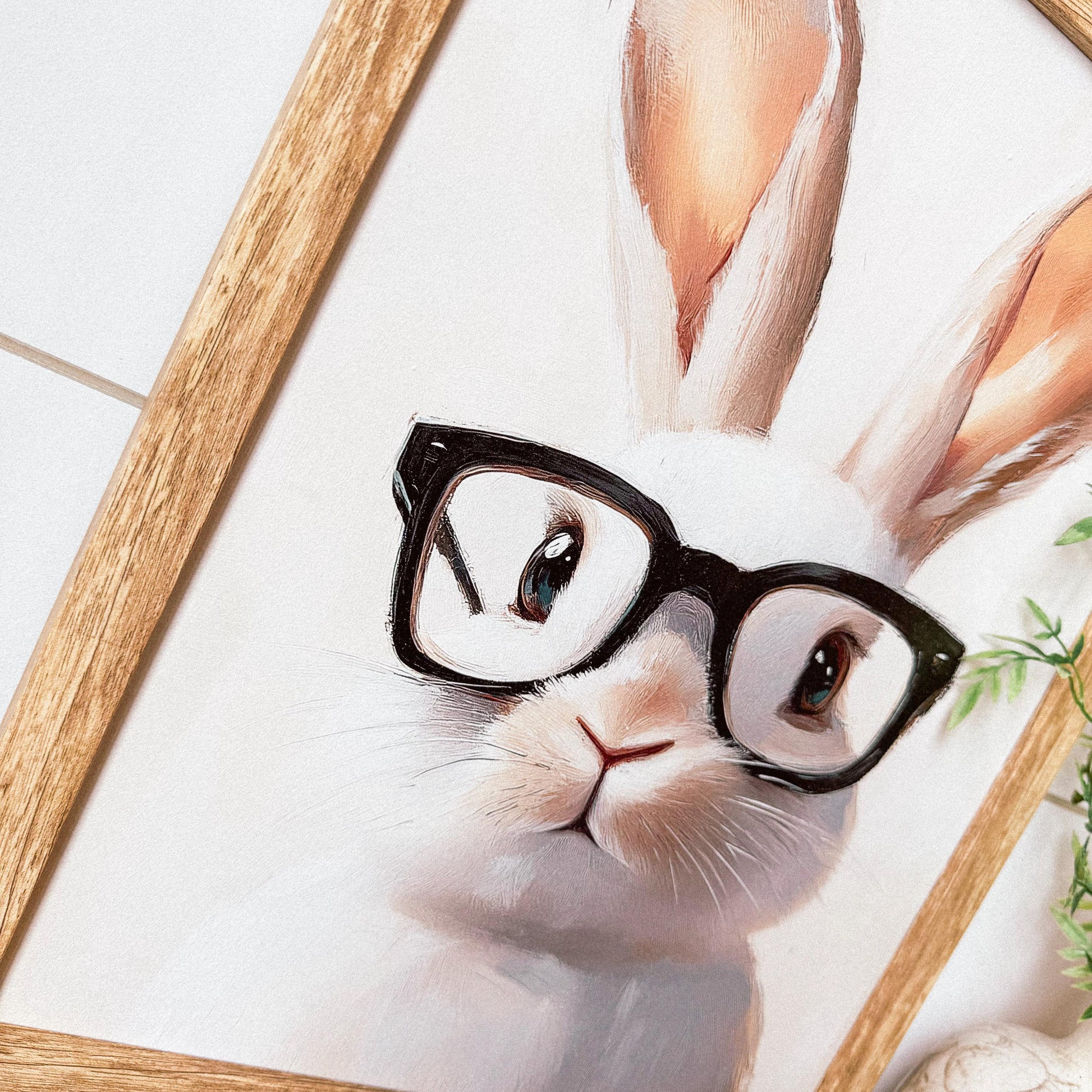 Handmade wooden sign with the cutest bunny with glasses print, perfect for your Spring and Easter decor. Almost 3D looking and printed directly on wood and framed in the frame color of your choice. Perfect for a statement piece or to add to a shelf.