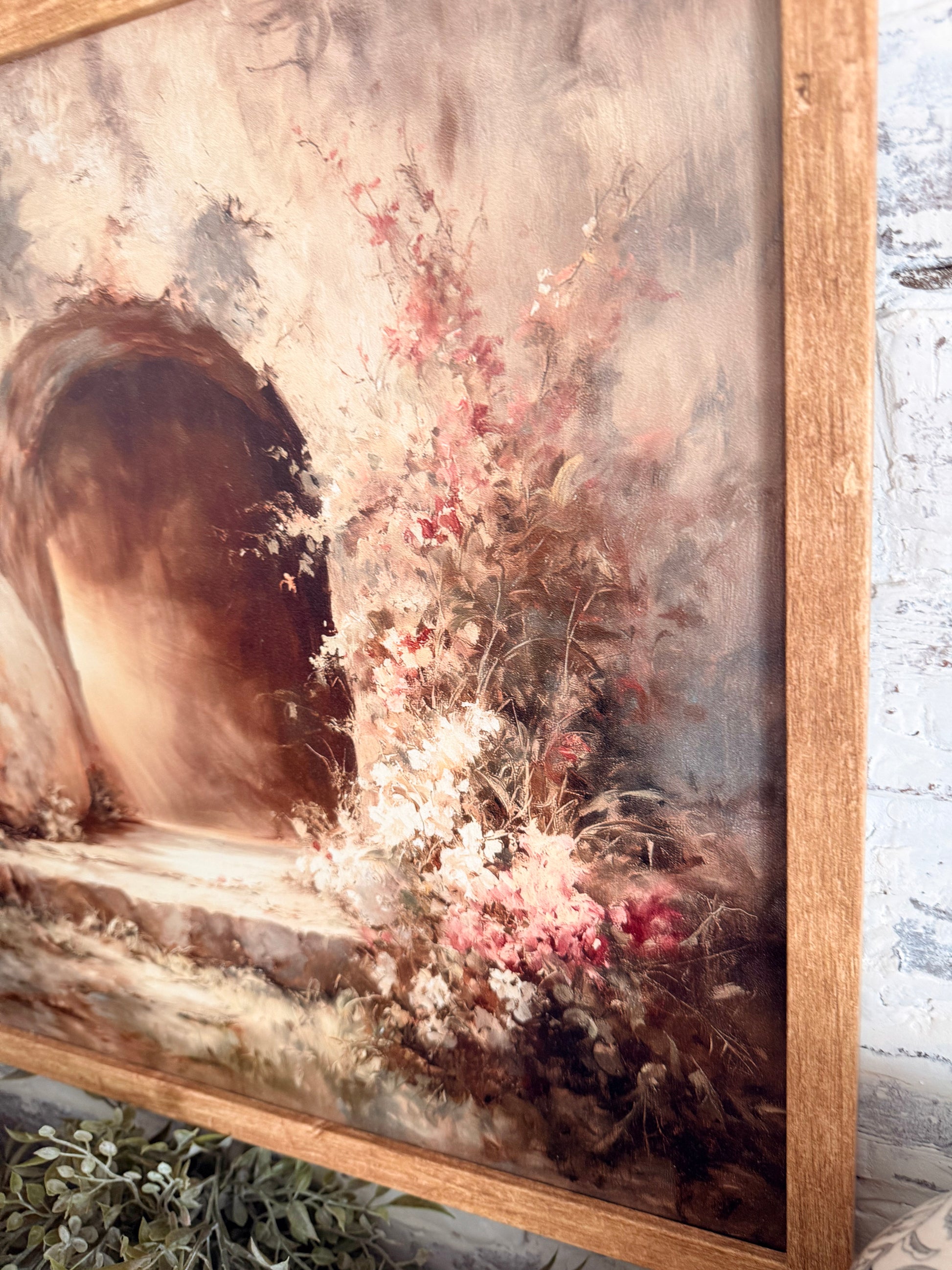 Handmade wooden sign with a beautiful depiction of Jesus' resurrection tomb, perfect for your Spring and Easter decor. Beautiful vintage color tones and printed directly on wood and framed in the frame color of your choice. Perfect for a statement piece or to add to a shelf.