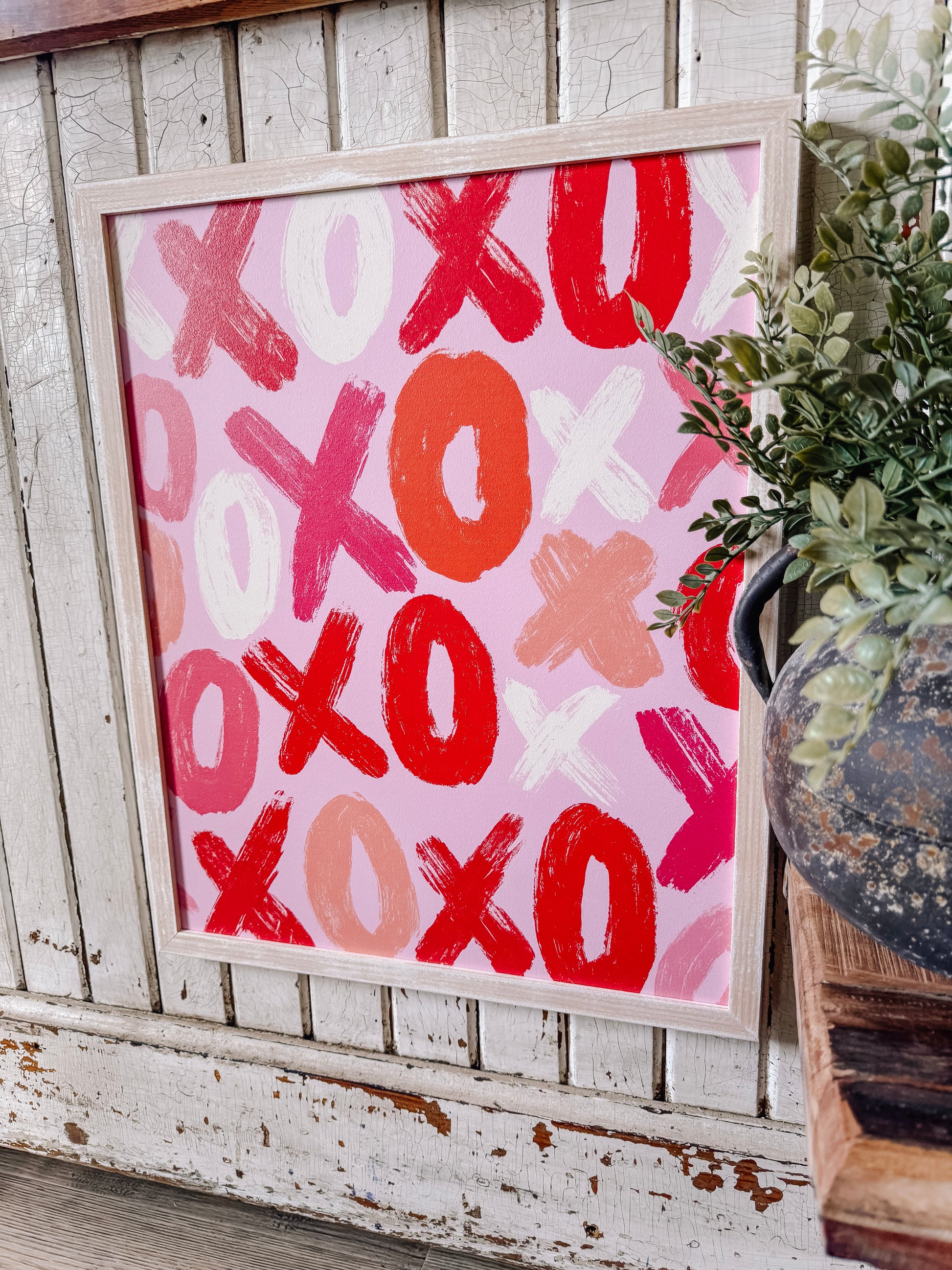 Handmade wooden farmhouse style sign with Valentines Day inspired XOXO pattern. Printed directly on wood and framed in the frame color of your choice. Perfect for a statement piece or to add to a shelf or little girls room.