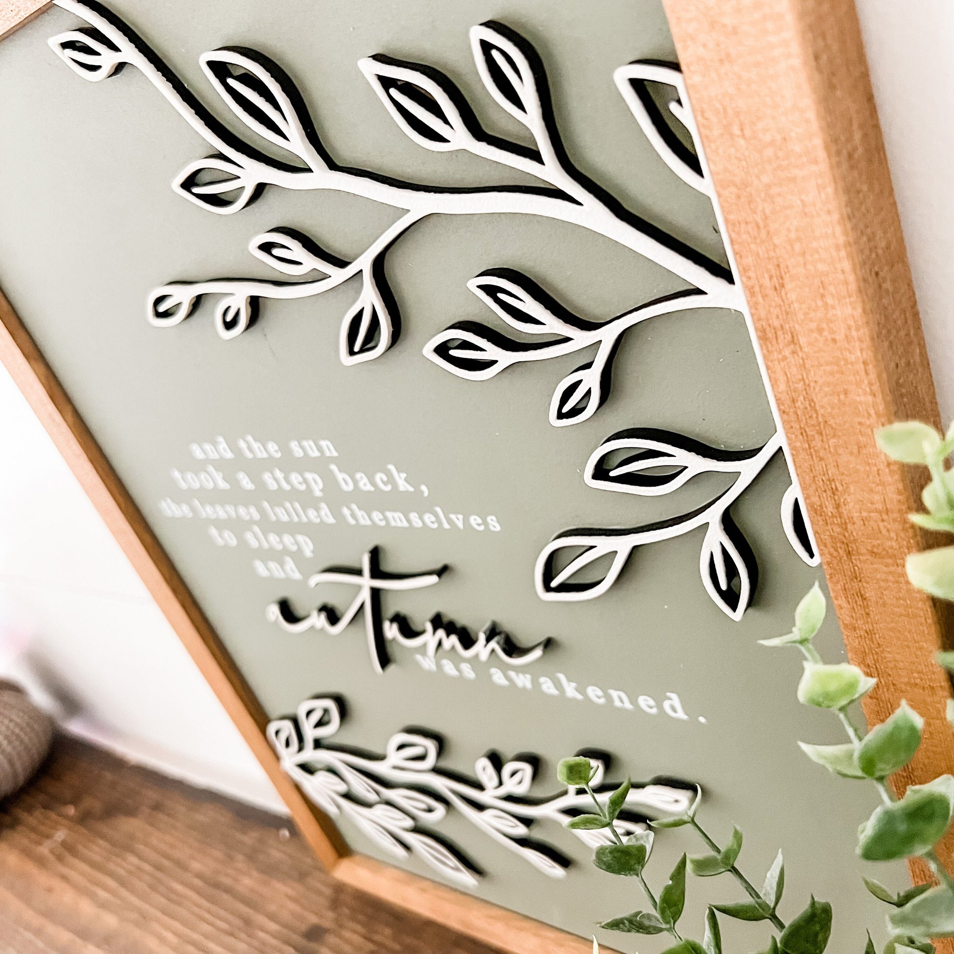 Handmade wooden sign with beautifully painted subtle green background that has fall quote on it. Each sign has laser cut lettering giving them an added, unique dimension.