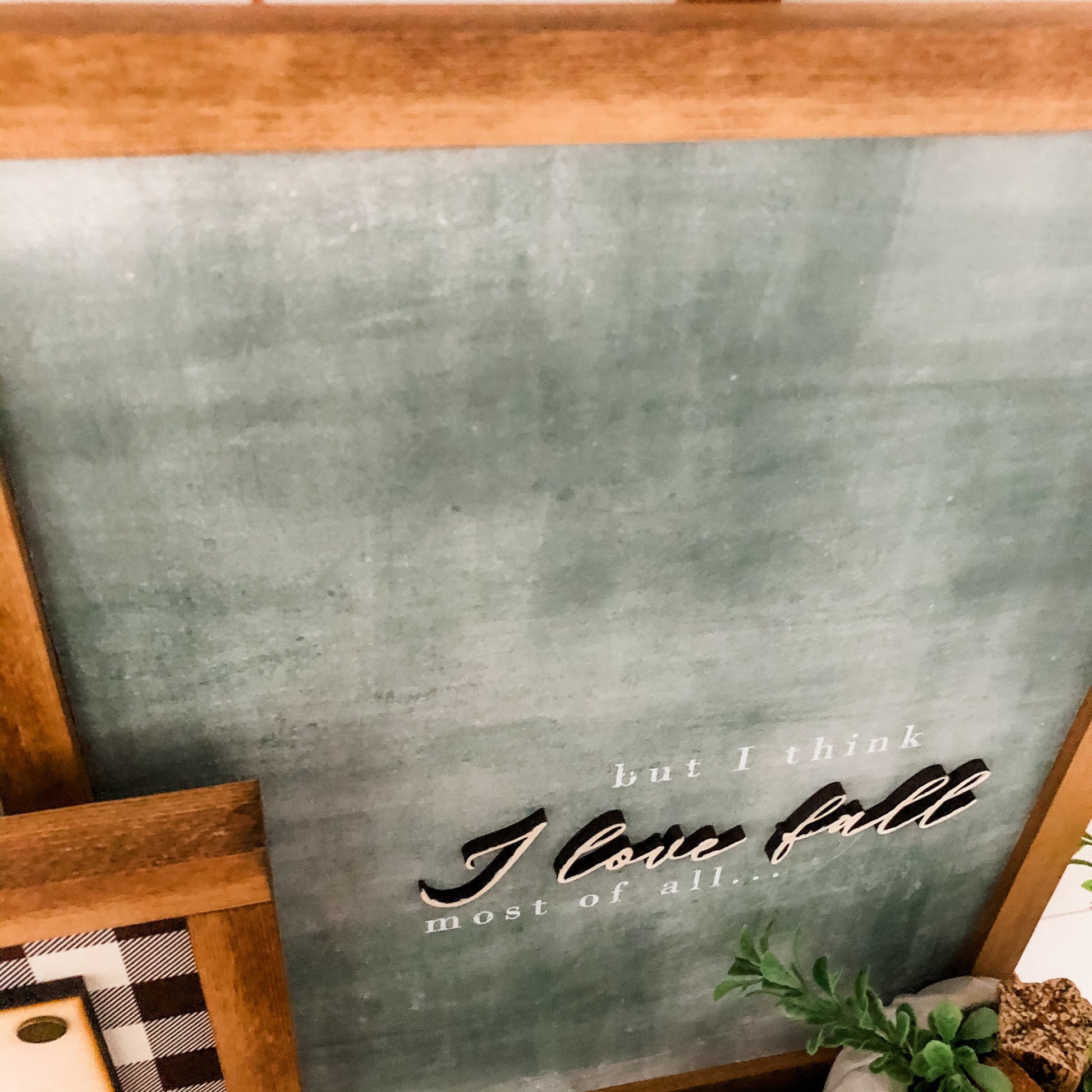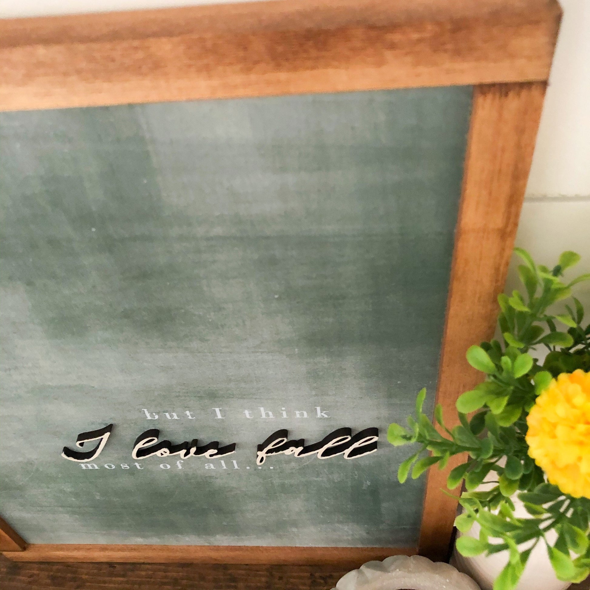 Handmade wooden sign with beautifully printed background that has fall quote on it. Each sign has laser cut lettering giving them an added, unique dimension. The background is a distressed chalkboard look. It is more rustic green in color!