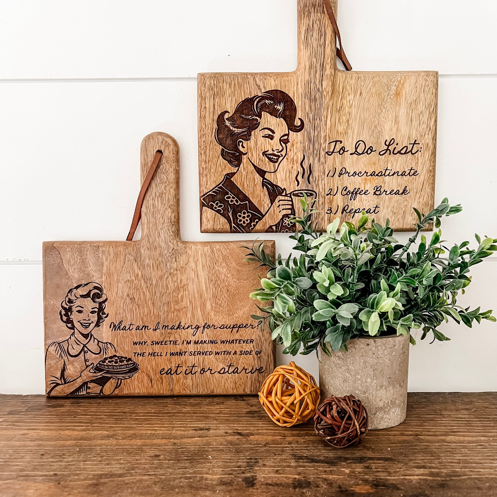 Funny engraved cutting boards perfect for a fun housewarming gift, Mother's Day or just a funny gift to give to a friend! There are four different sayings to choose from and can be selected from the dropdown.