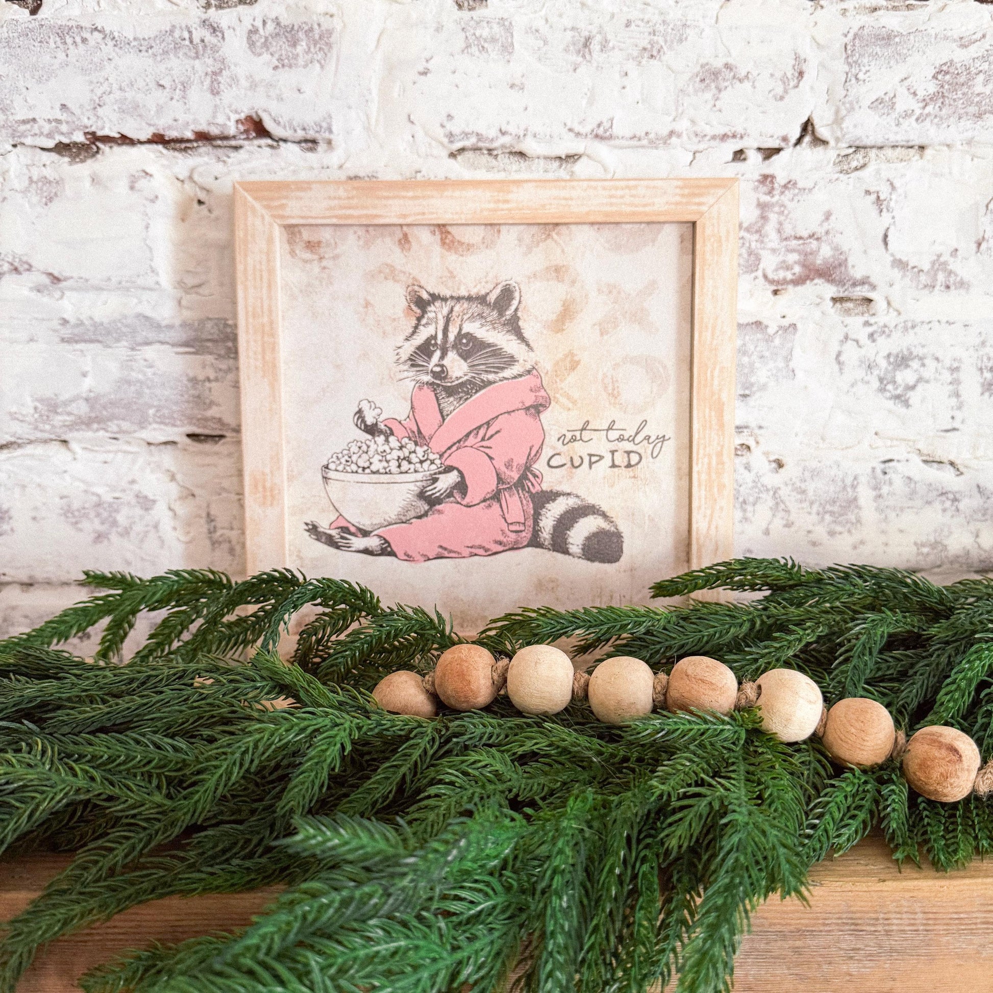 Handmade wooden farmhouse style sign with funny Valentines Day raccoon in a robe with the wording not today cupid. Printed directly on wood and framed in the frame color of your choice. Perfect for a a funny addition to your Valentines Day decor.