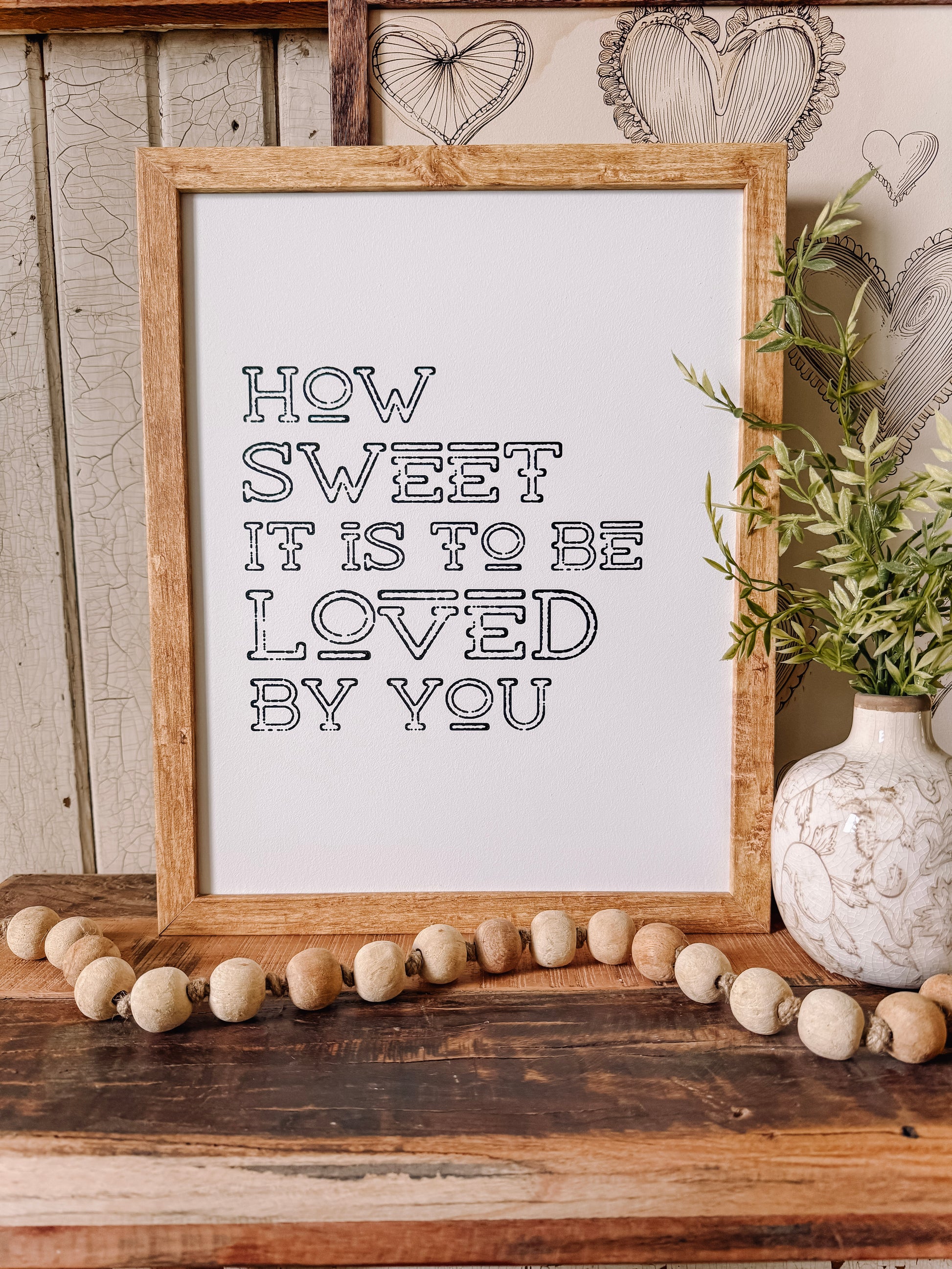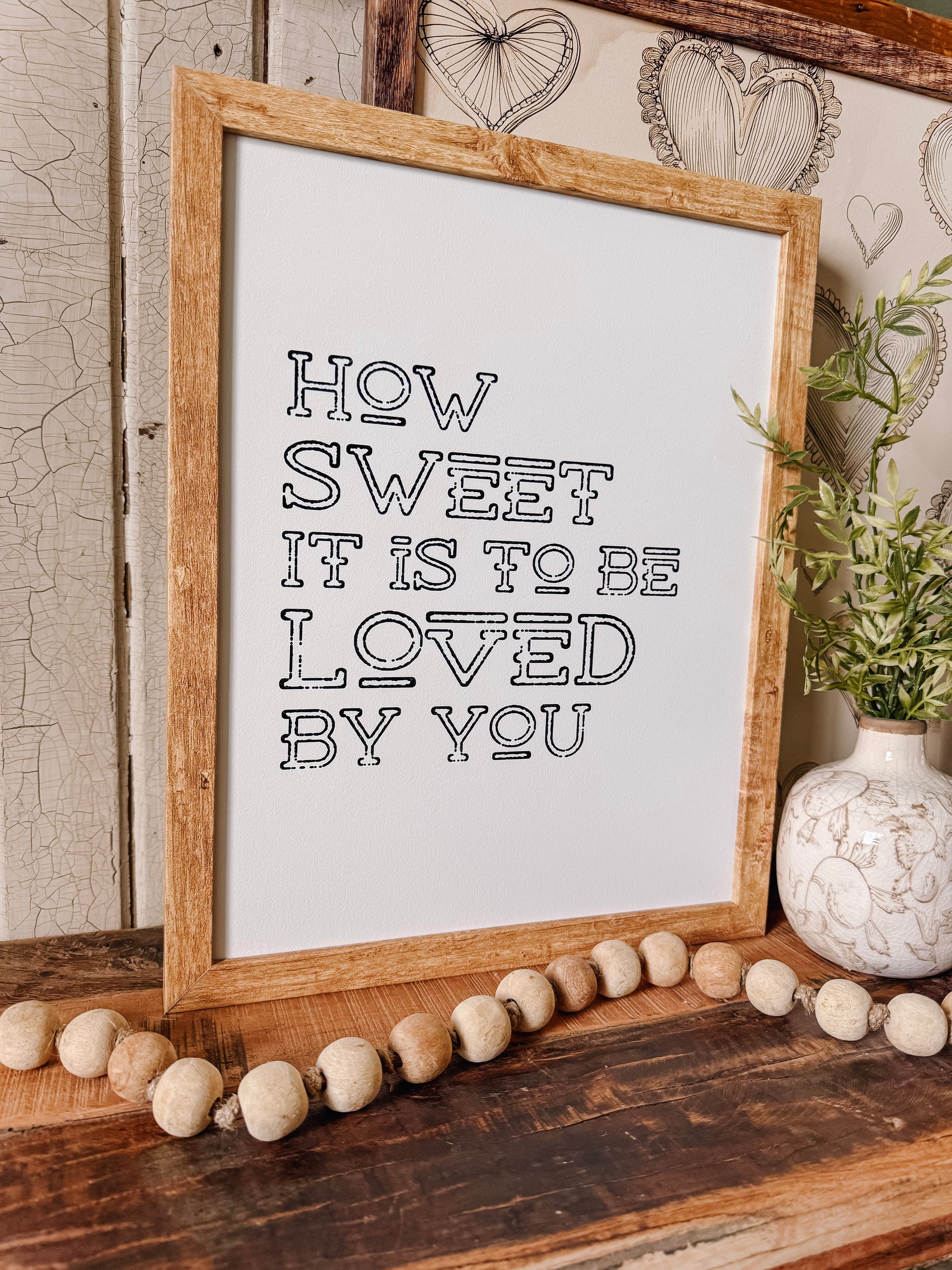Handmade wooden farmhouse style sign with "How sweet it is to be loved by you" wording. Printed directly on wood and framed in the frame color of your choice. Perfect for a statement piece or to add to a shelf.