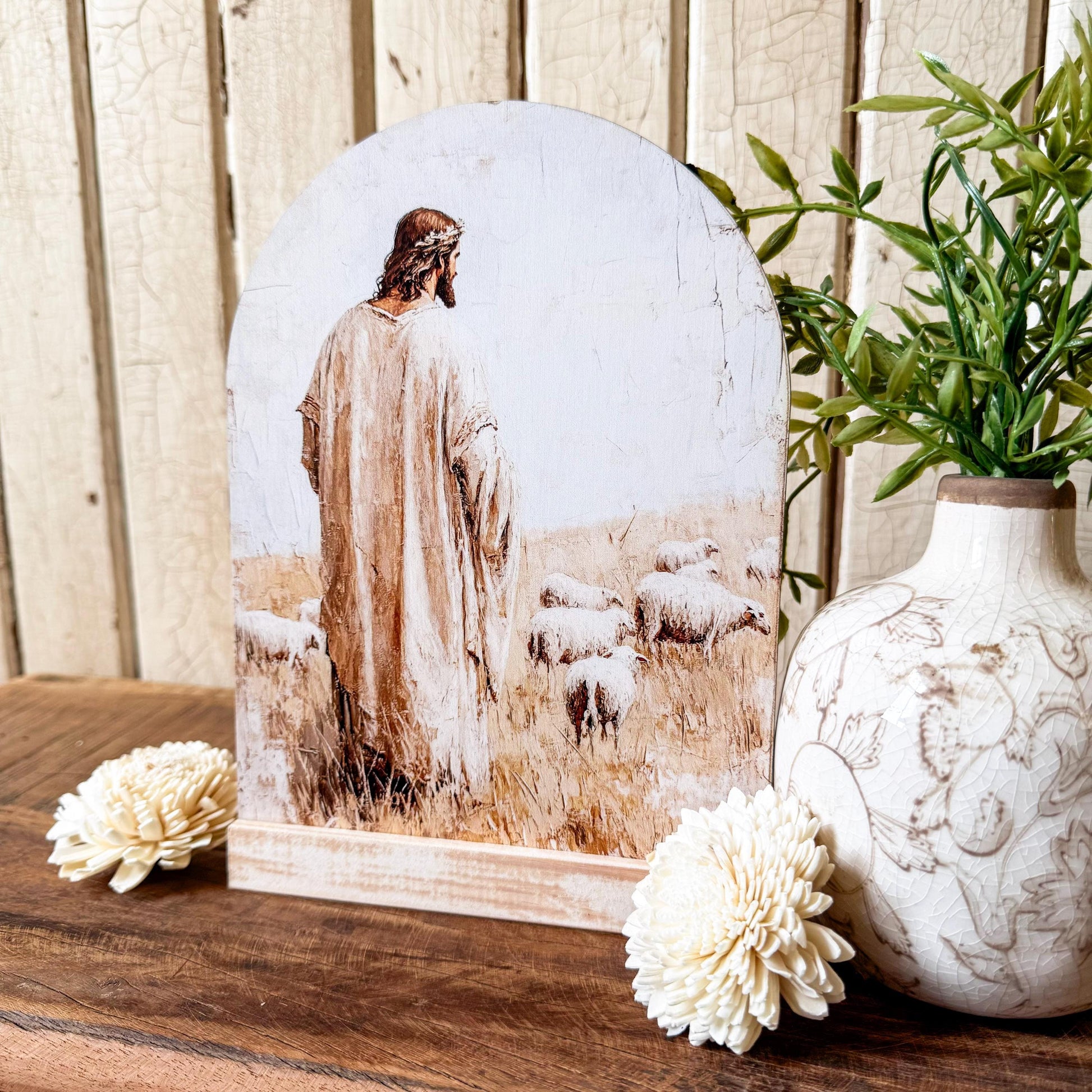 Jesus with Sheep Arched Wood Sign Shelf Sitter