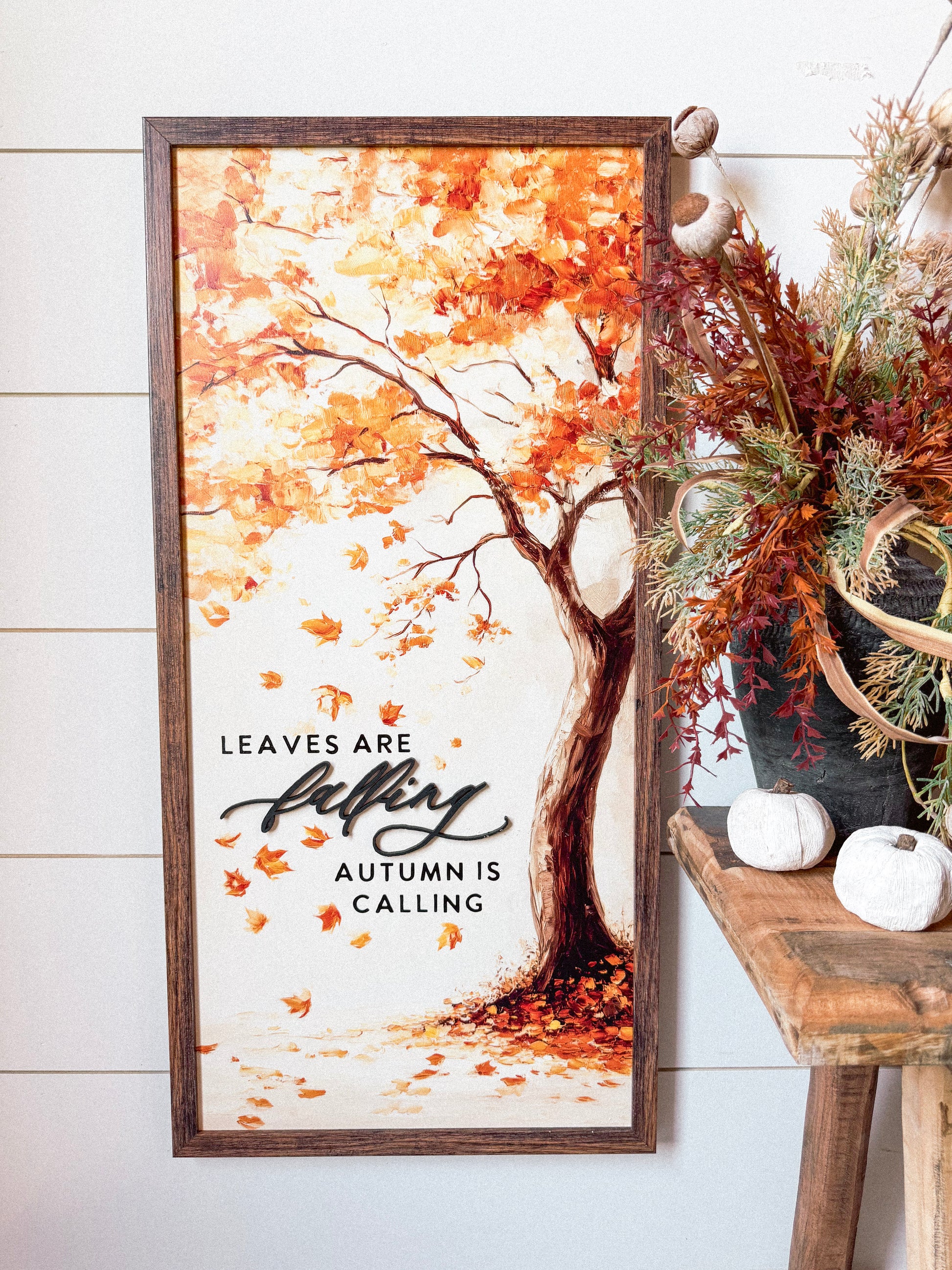 Handmade wooden sign with vintage fall leaves falling a tree with 'leaves are falling, autumn is calling wording. The falling wording is laser cut, giving them an added dimension.
