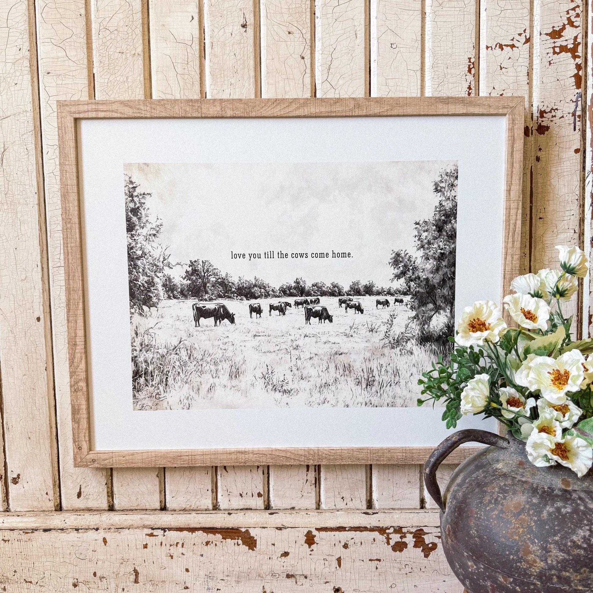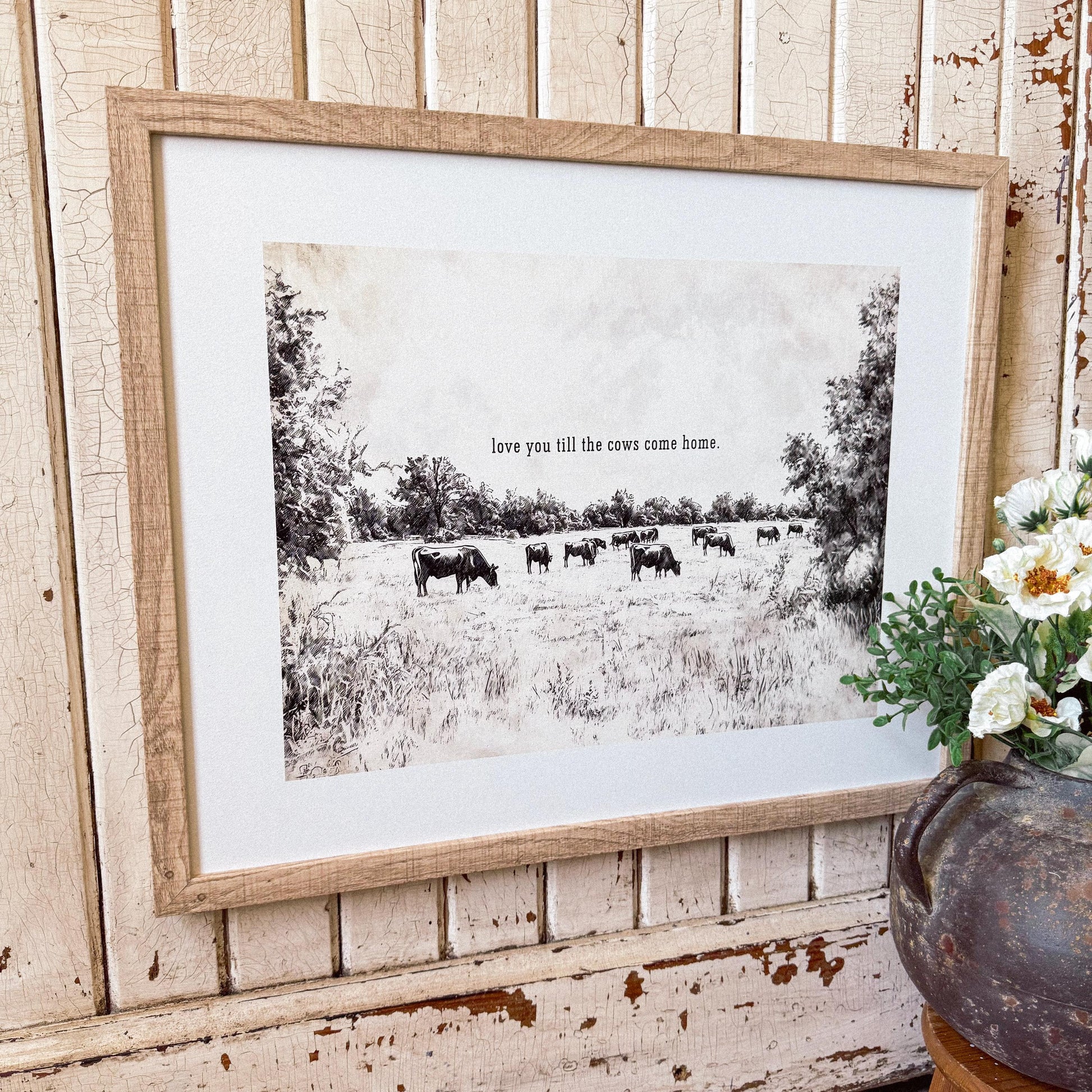 Handmade farmhouse wooden sign with vintage style cows grazing with "love you till the cows come home" wording, This print is vintage in nature and printed directly on wood and framed in the frame color of your choice. Perfect for a statement piece or to add to a shelf.