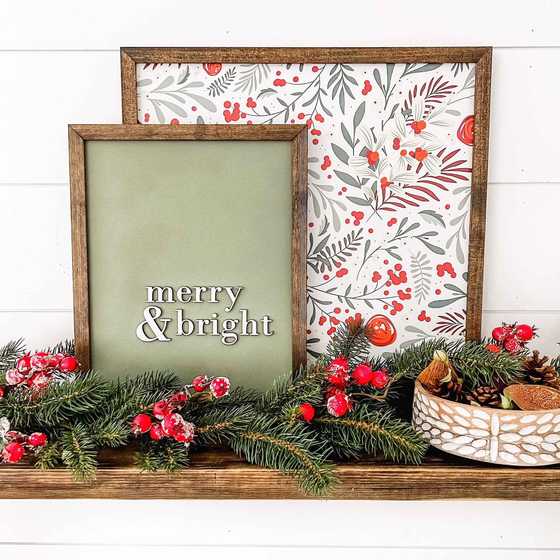 Handmade Christmas wood sign with Merry & Bright wording that is laser cut, giving each sign an added unique dimension. The background color is green in color. Framed in color of your choice from the options provided.