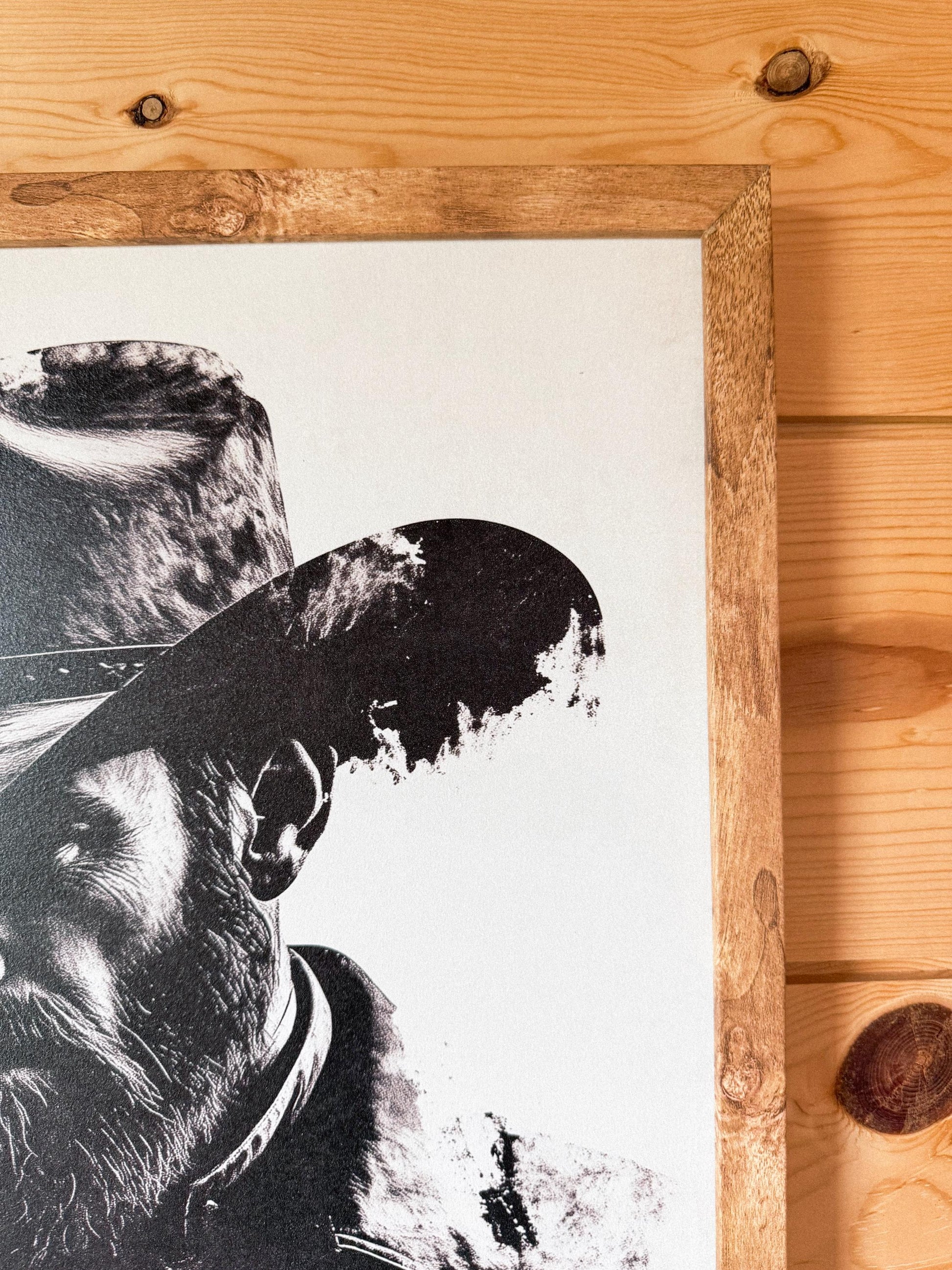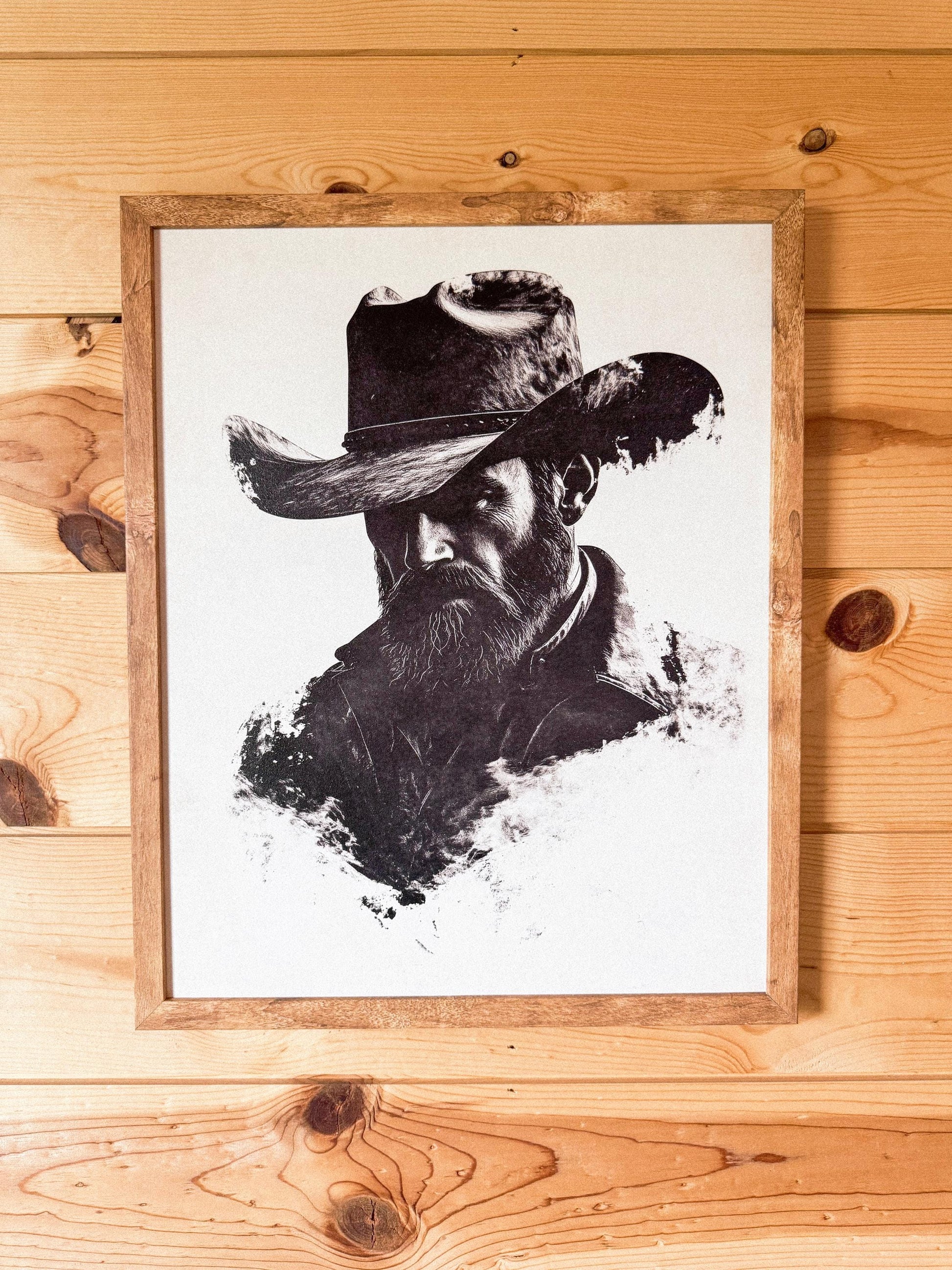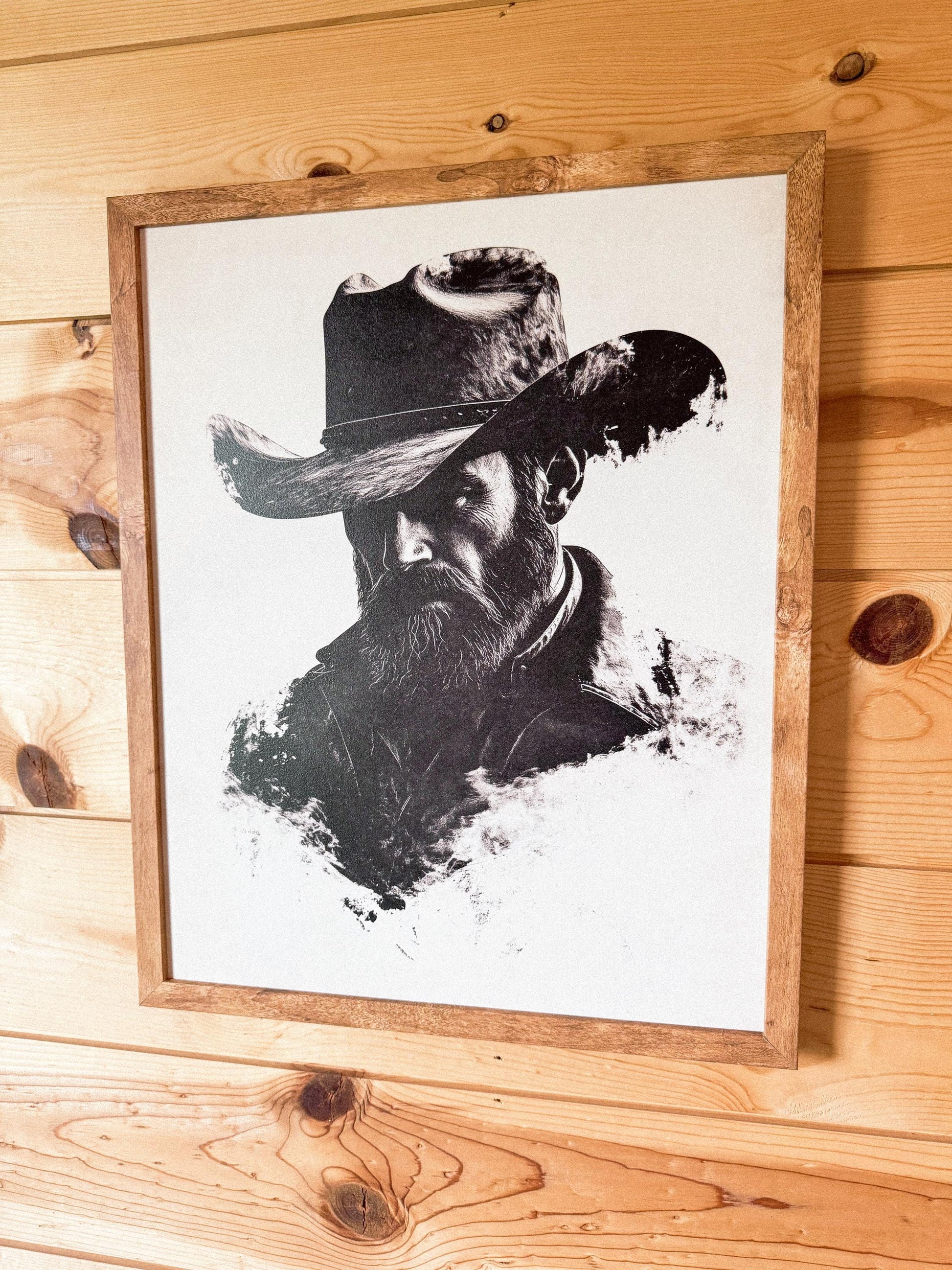 Handmade wooden sign with neutral colored cowboy in cowboy hat. Vintage style and printed directly on wood and framed in the frame color of your choice. Perfect for a statement piece or to add to a shelf.