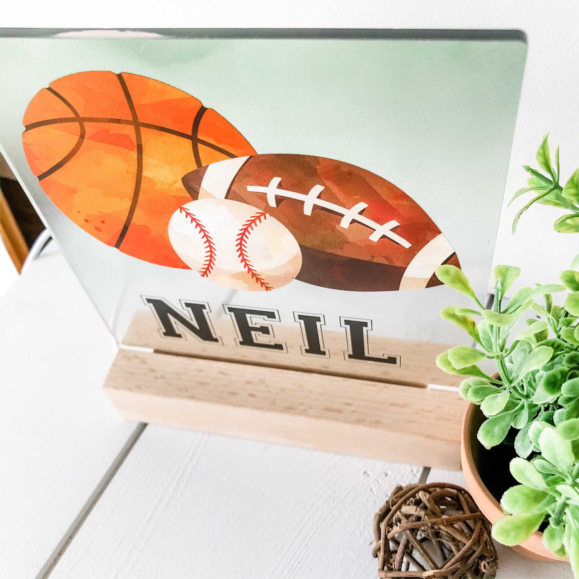 Personalized sports themed night light perfect for a nursery, play room, or children's room! Customized with your favorite sport(s) and name!
