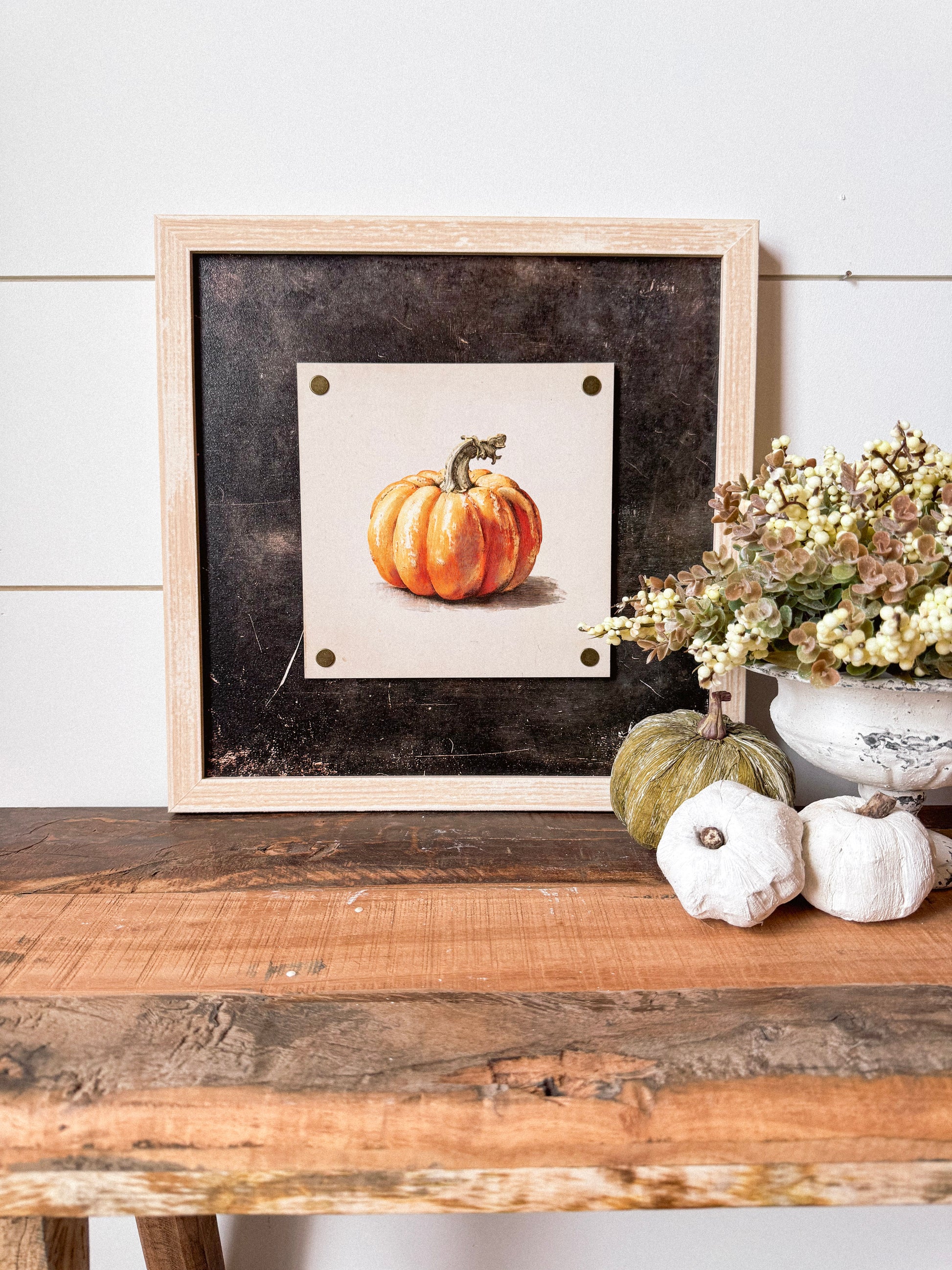 Handmade wooden sign with orange pumpkin printed on wood plaque attached to sign with 4 vintage style nail pins in the corners. Each sign has a unique layered piece giving them an added dimension.