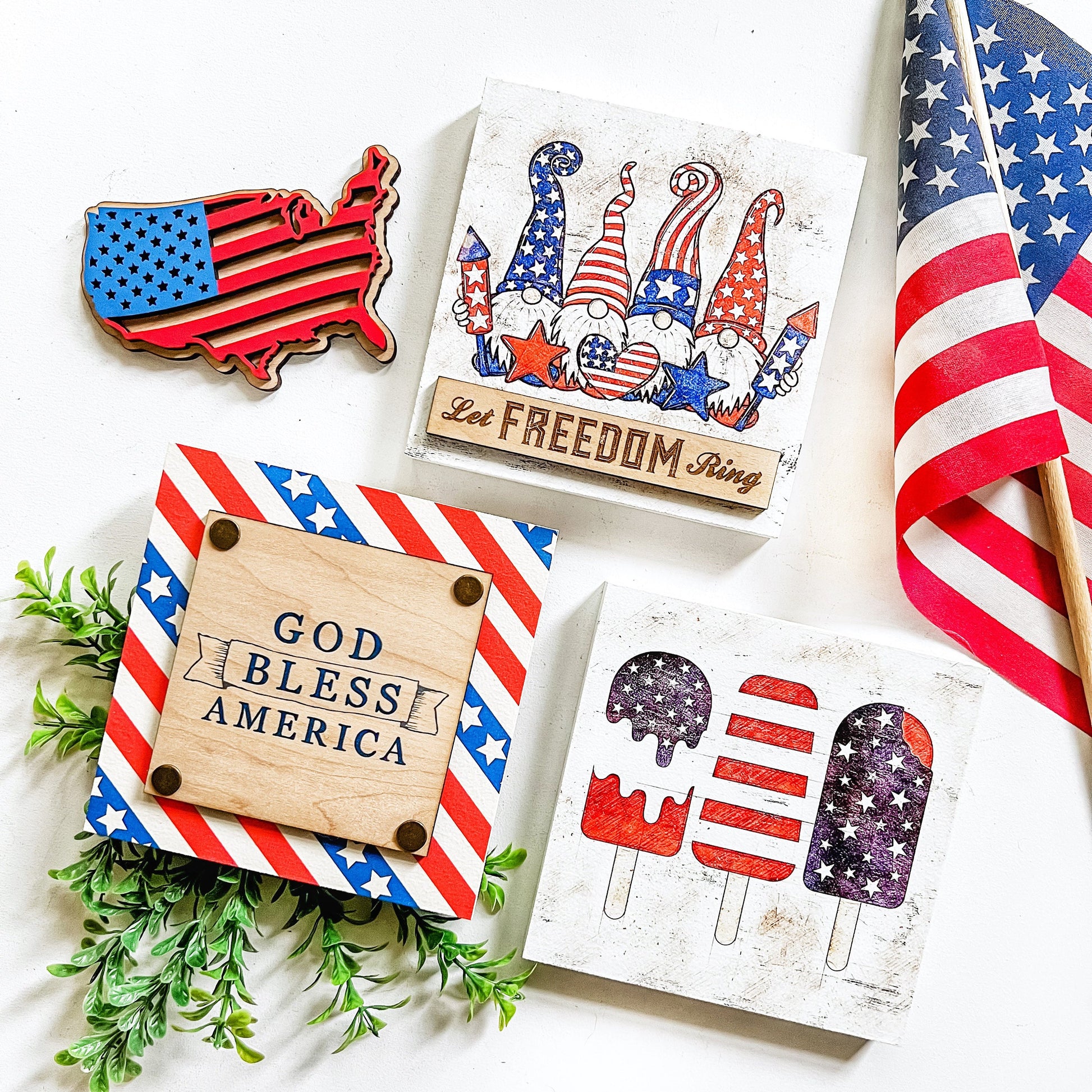 Patriotic mini tiered tray wood blocks, perfect for 4th of July, Memorial Day and Labor Day celebrations. Fit perfect in your tiered tray displays or perfect to sit on a shelf with your other decor!