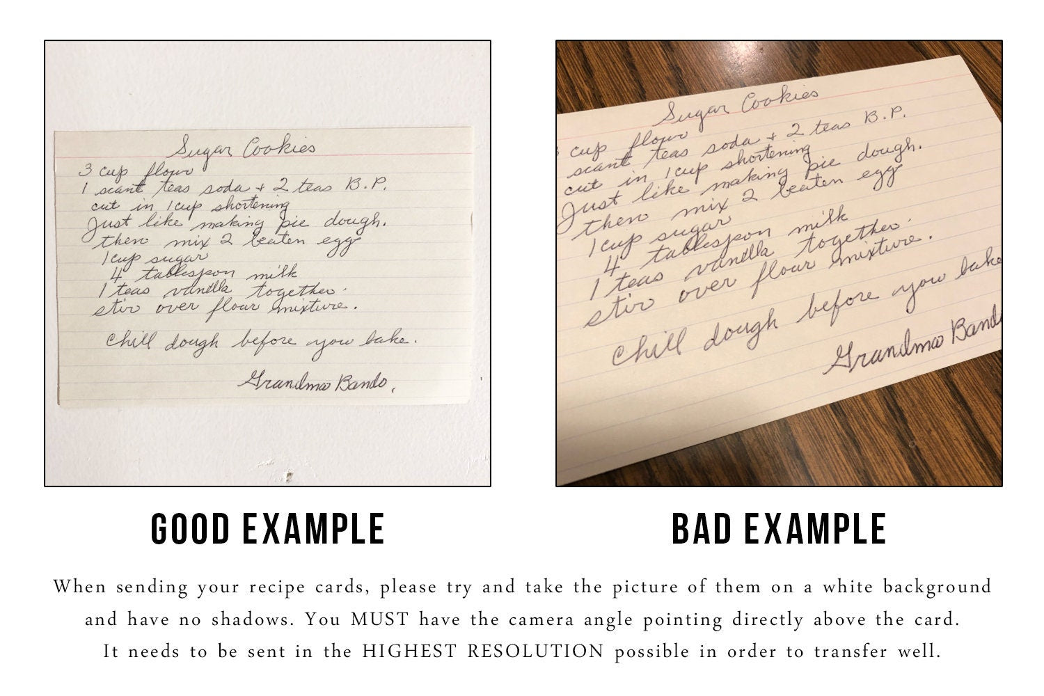 3.) If sending and actual photo (not a scan) please reference the photo that shows how to best take the picture of the recipe card so it transfers well! Please note: Photos need to be sent over in the HIGHEST RESOLUTION possible. I will print the recipe based on the photo provided and the lower the resolution, the lower the quality of printing.