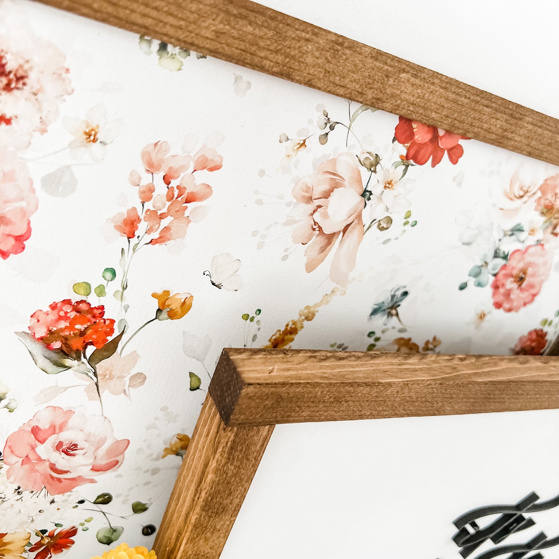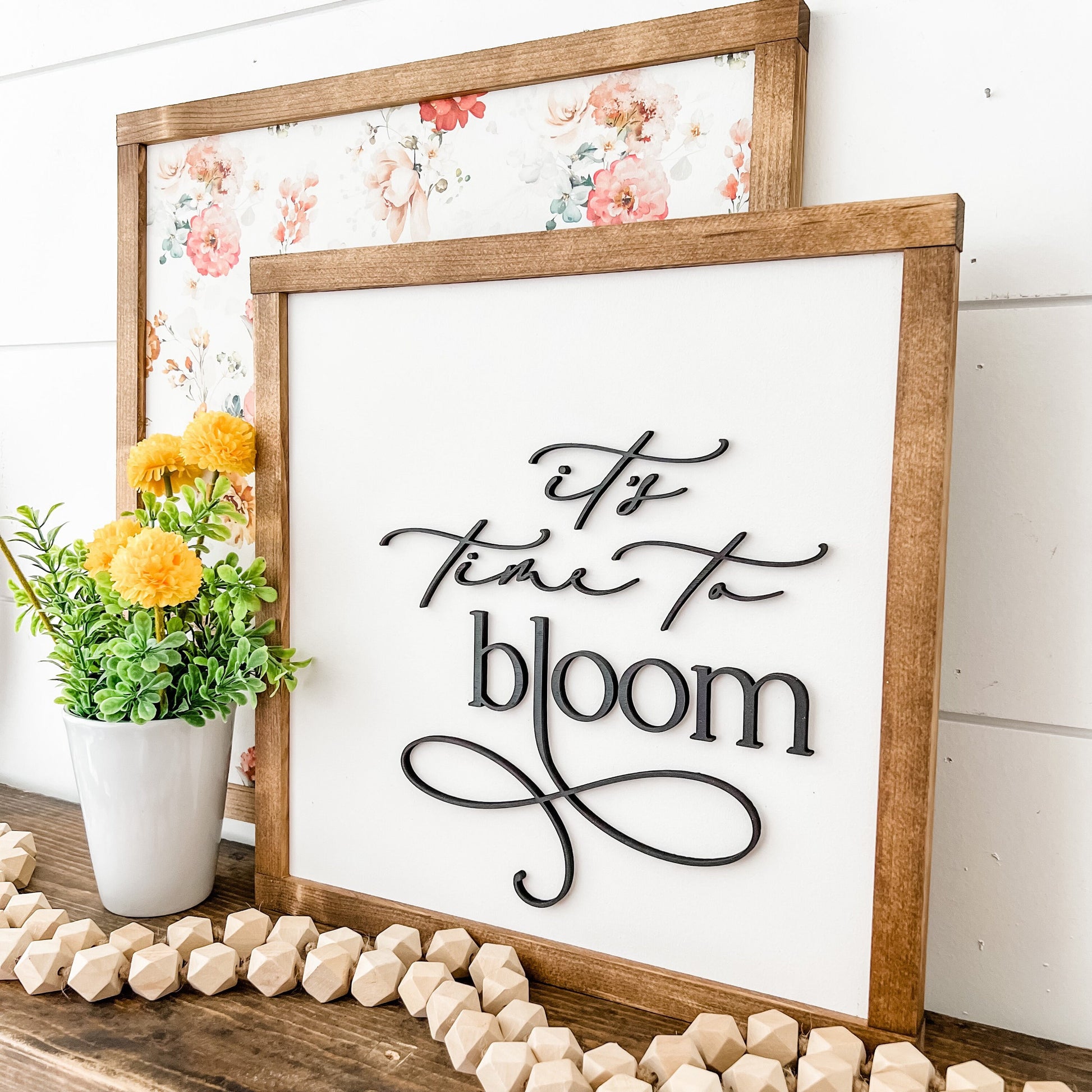 SIZE: Floral sign: 15x15" // It's Time to Bloom: 12x12" Add about 3/4" to each side to include the frame in those measurements.