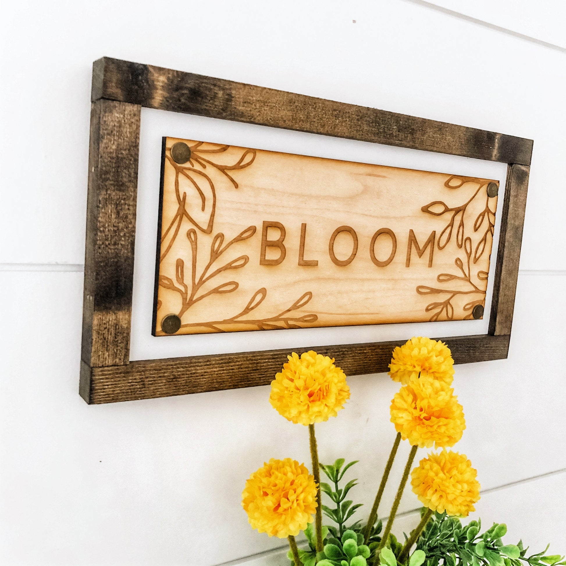 Handmade wooden spring sign, with painted white background. The bloom word is laser etched in wood and nailed on in all 4 corners with antique brass nails.