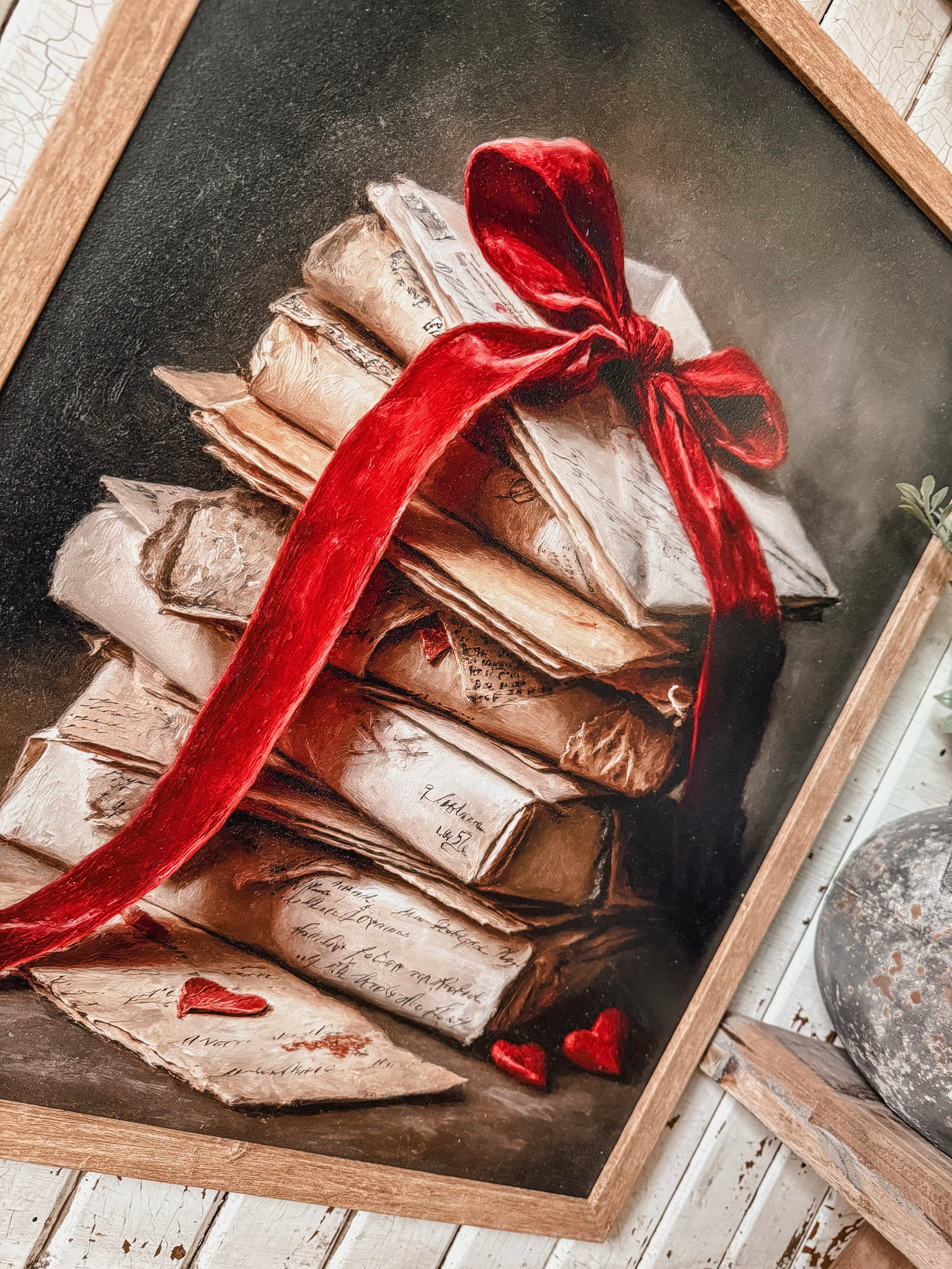 Handmade wooden farmhouse style sign with Valentines Day inspired stack of love letters with a moody feel to it. Image has a textured look and printed directly on wood and framed in the frame color of your choice. Perfect for a statement piece or to add to a shelf.