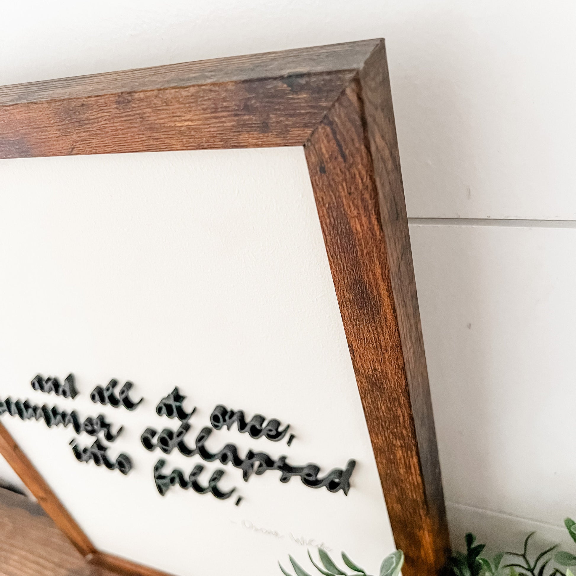 Handmade wooden sign with Oscar Wilde summer collapsed into fall quote. Each sign has laser cut lettering giving them an added, unique dimension. The background is an off white color.