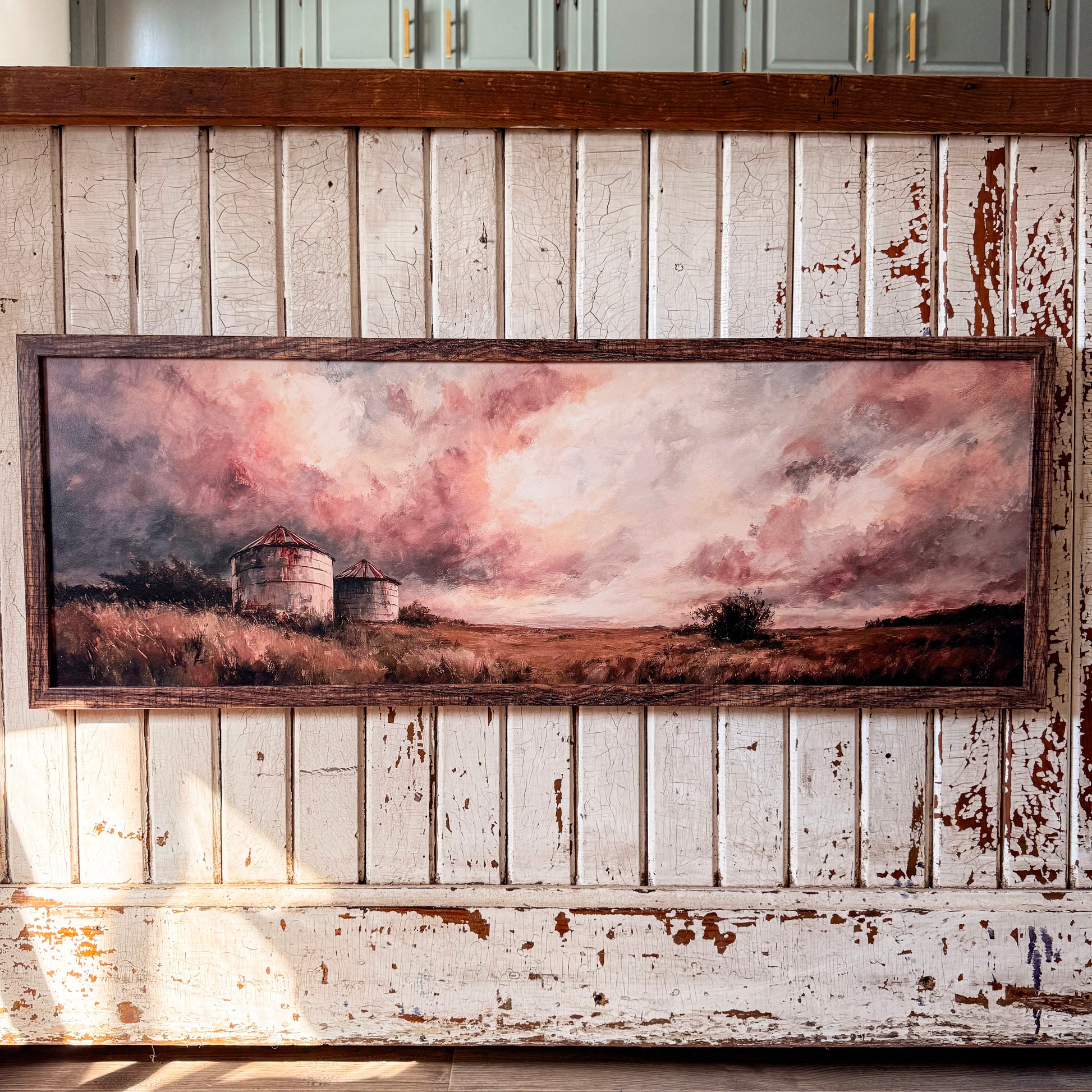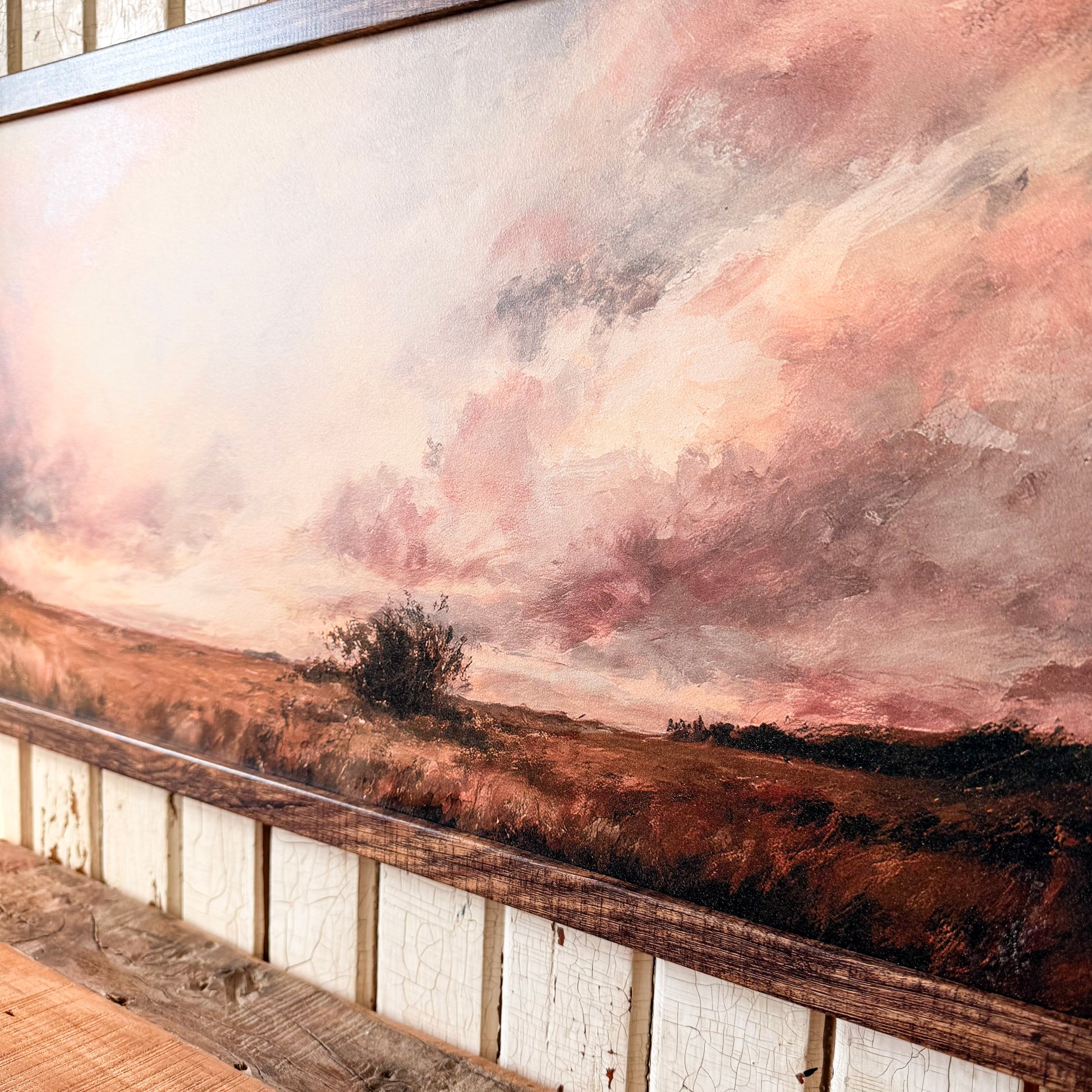 Handmade wooden sign with a beautiful scenic country landscape with a spring and summer type illuminating sky, perfect for your every day decor. Bold and dramatic color tones and printed directly on wood and framed in the frame color of your choice. Perfect for a statement piece or to add to a shelf.