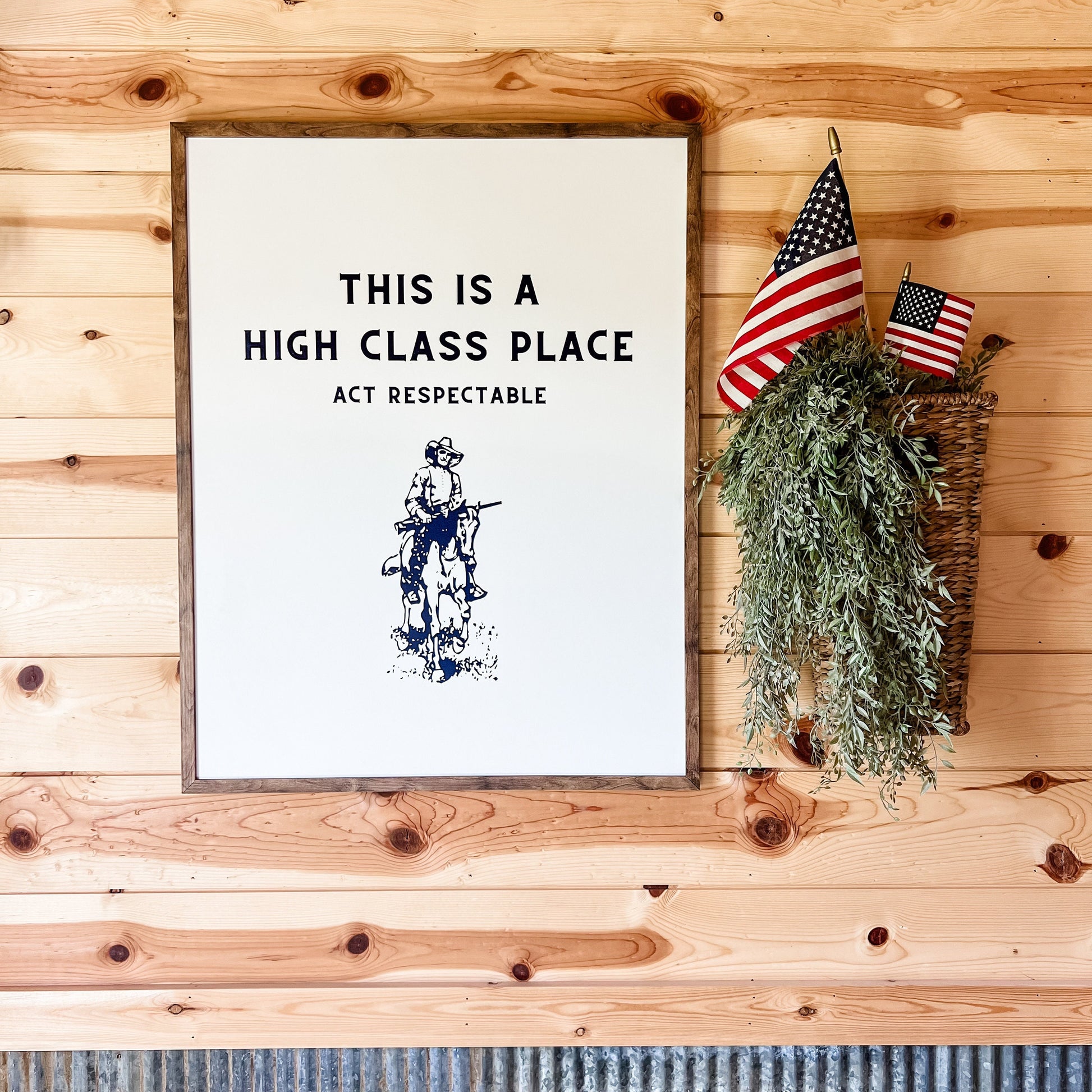 Handmade wooden sign with 'This is a high class place, act respectable' saying on it. Modern and western in style and printed directly on wood and framed in the frame color of your choice. Perfect for a statement piece or to add to a shelf.