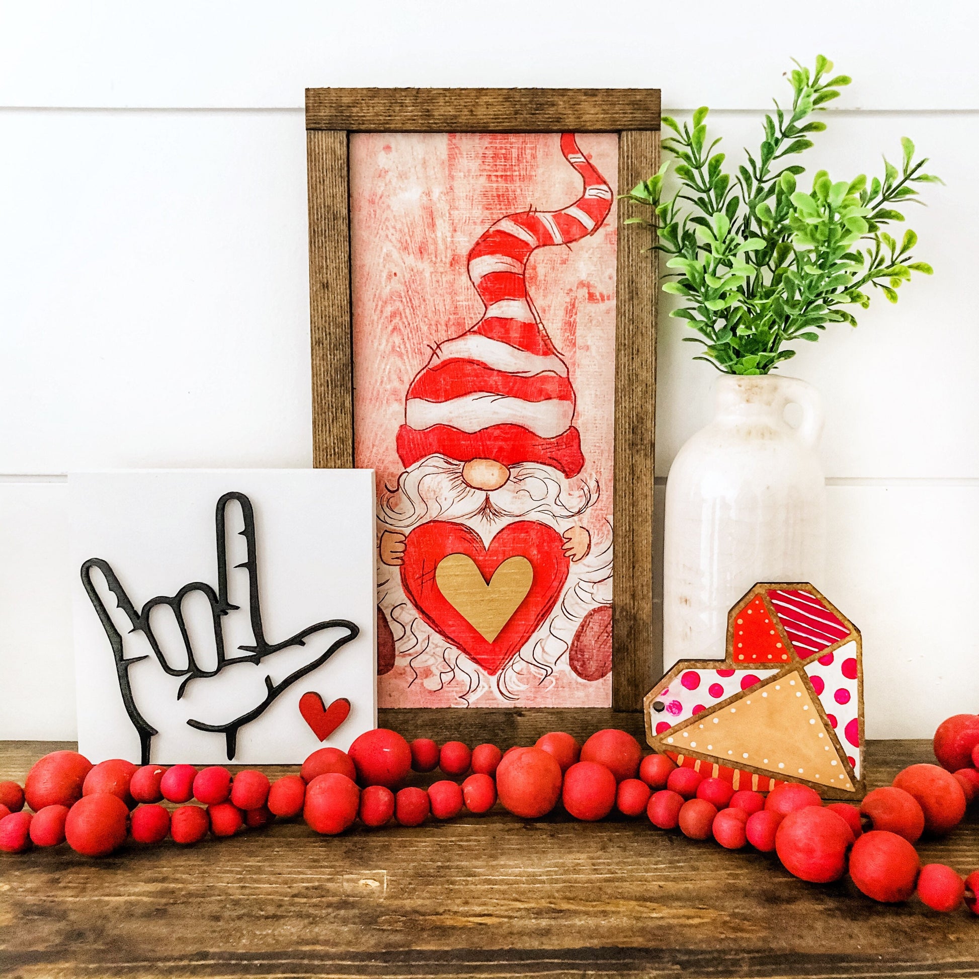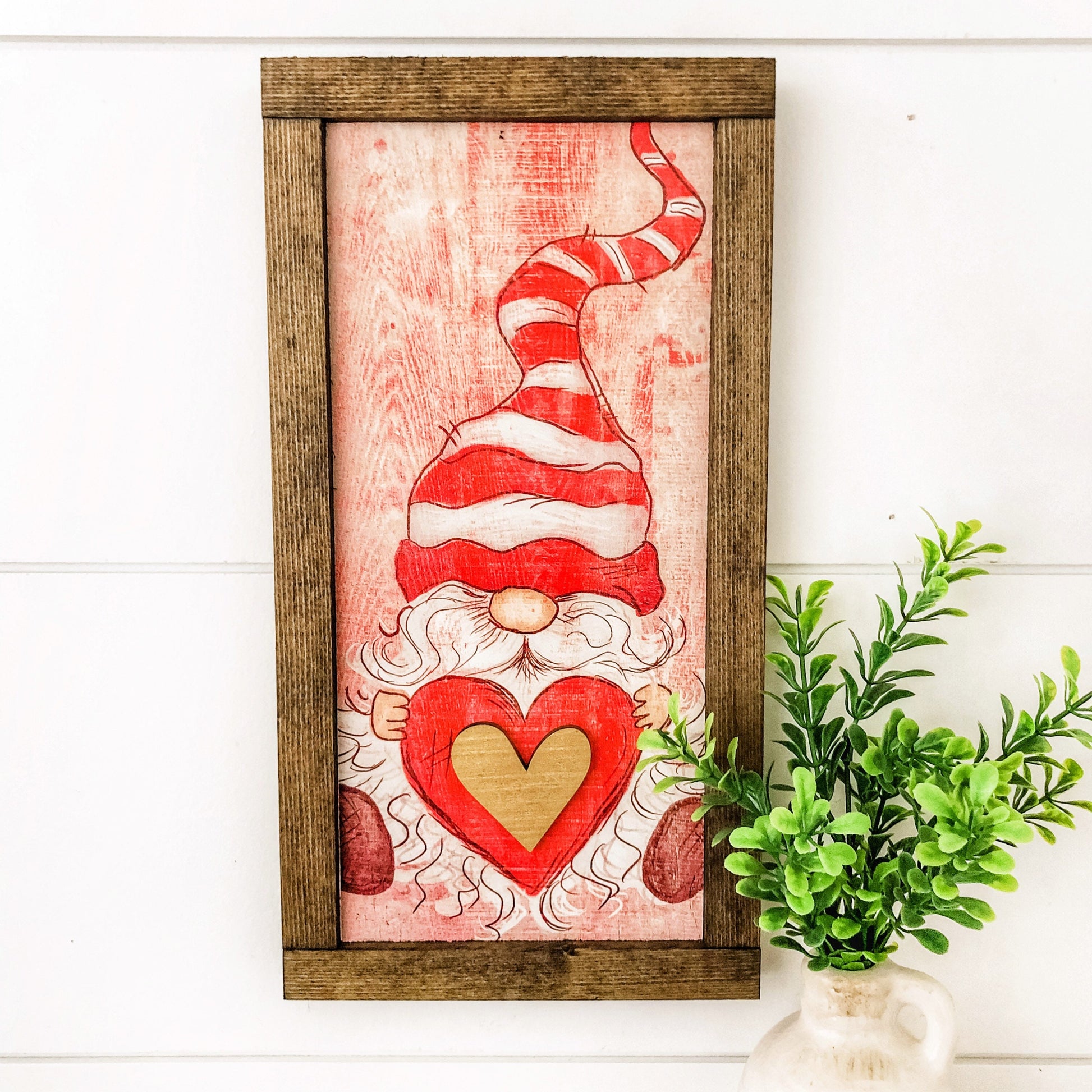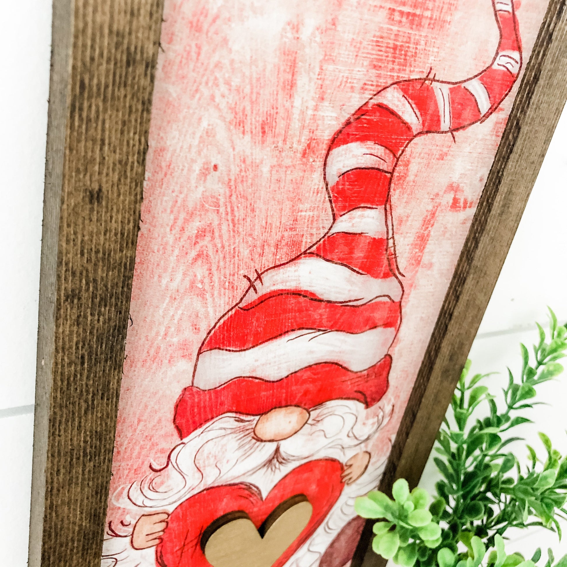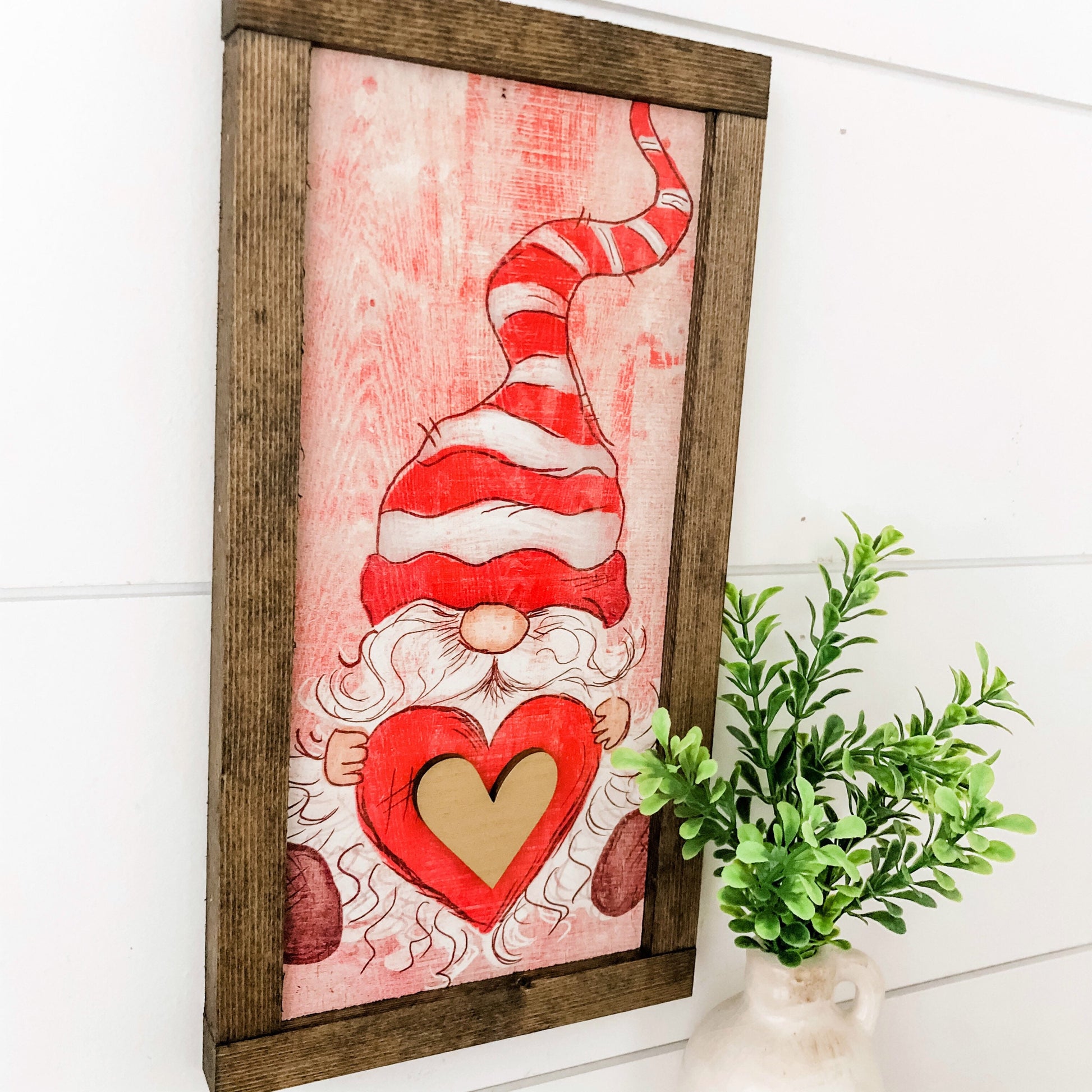Handmade wooden sign with Valentines Day gnome design, framed in dark colored frame. Sign is digitally printed on surface with laser cut elements to give each sign an added dimension.