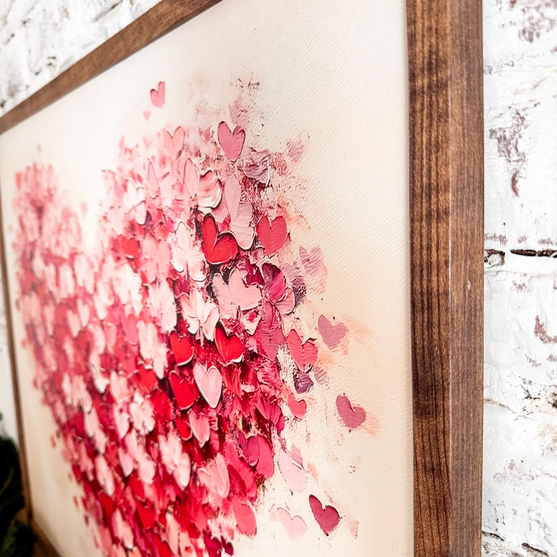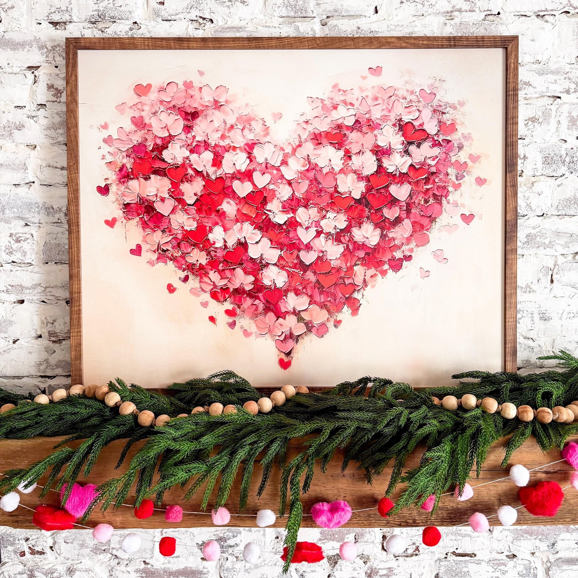 Handmade wooden farmhouse style sign with Valentines Day heart shape. Heart has a textured look and printed directly on wood and framed in the frame color of your choice. Perfect for a statement piece or to add to a shelf.