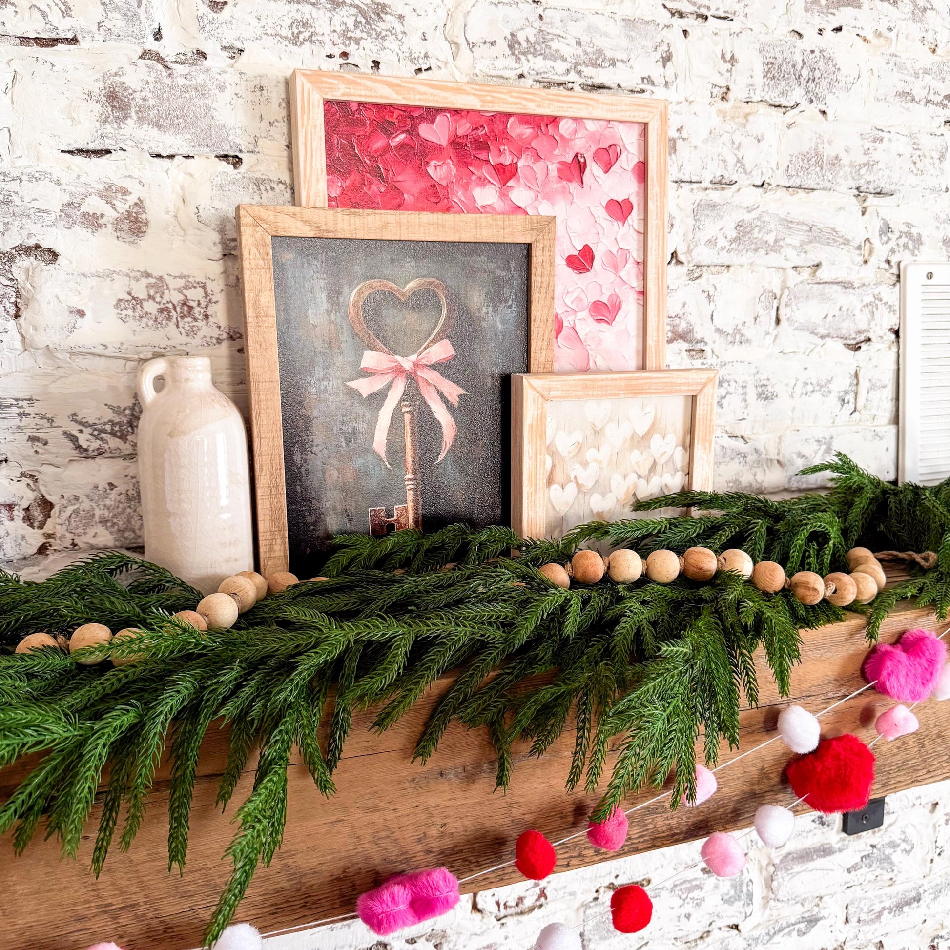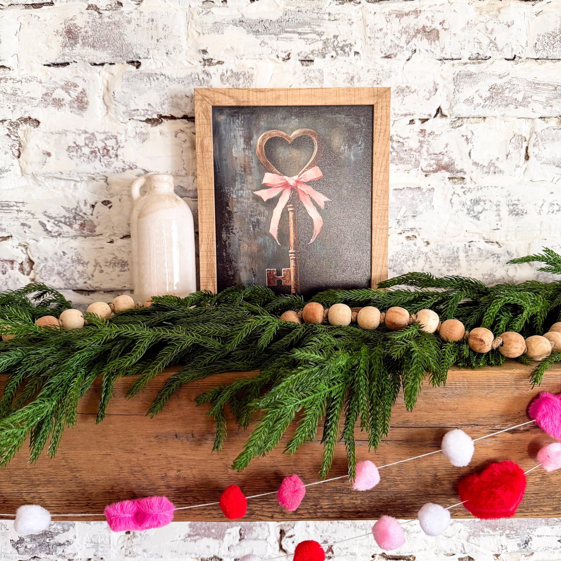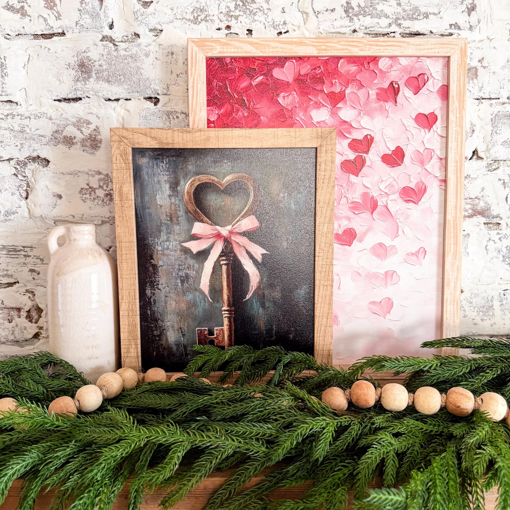 Handmade wooden farmhouse style sign with unique vintage style key and pink bow. Print has a vintage and textured look and printed directly on wood and framed in the frame color of your choice. Perfect for a statement piece or to add to a shelf.