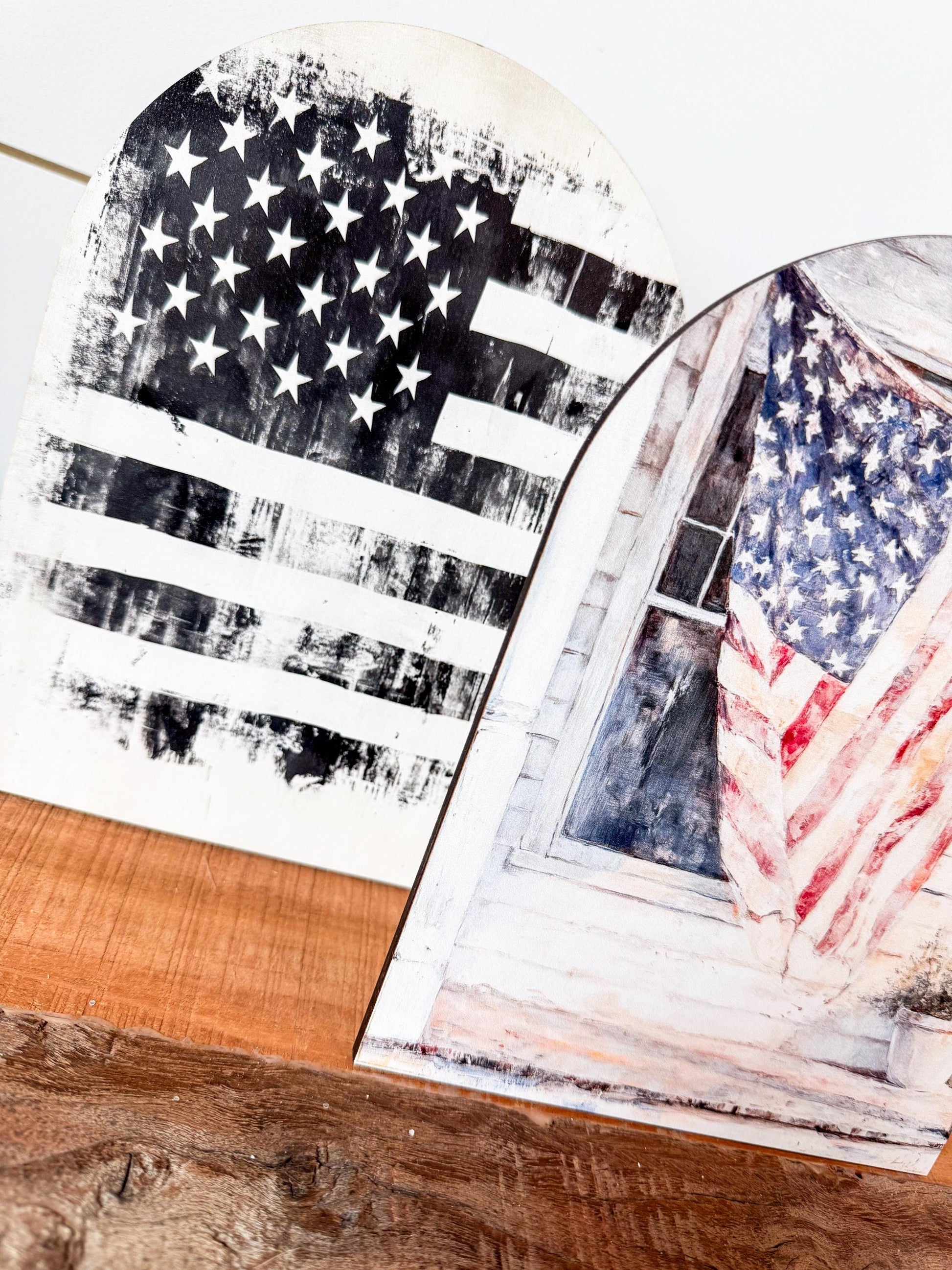 Vintage 4th of July American Flag Arched Sign Add an easy accent to any shelf or bookshelf display with these unique wooden arched shelf sitters! Perfect for an easy transition of seasonal decor. Lightweight and come with two options to stand on their own.