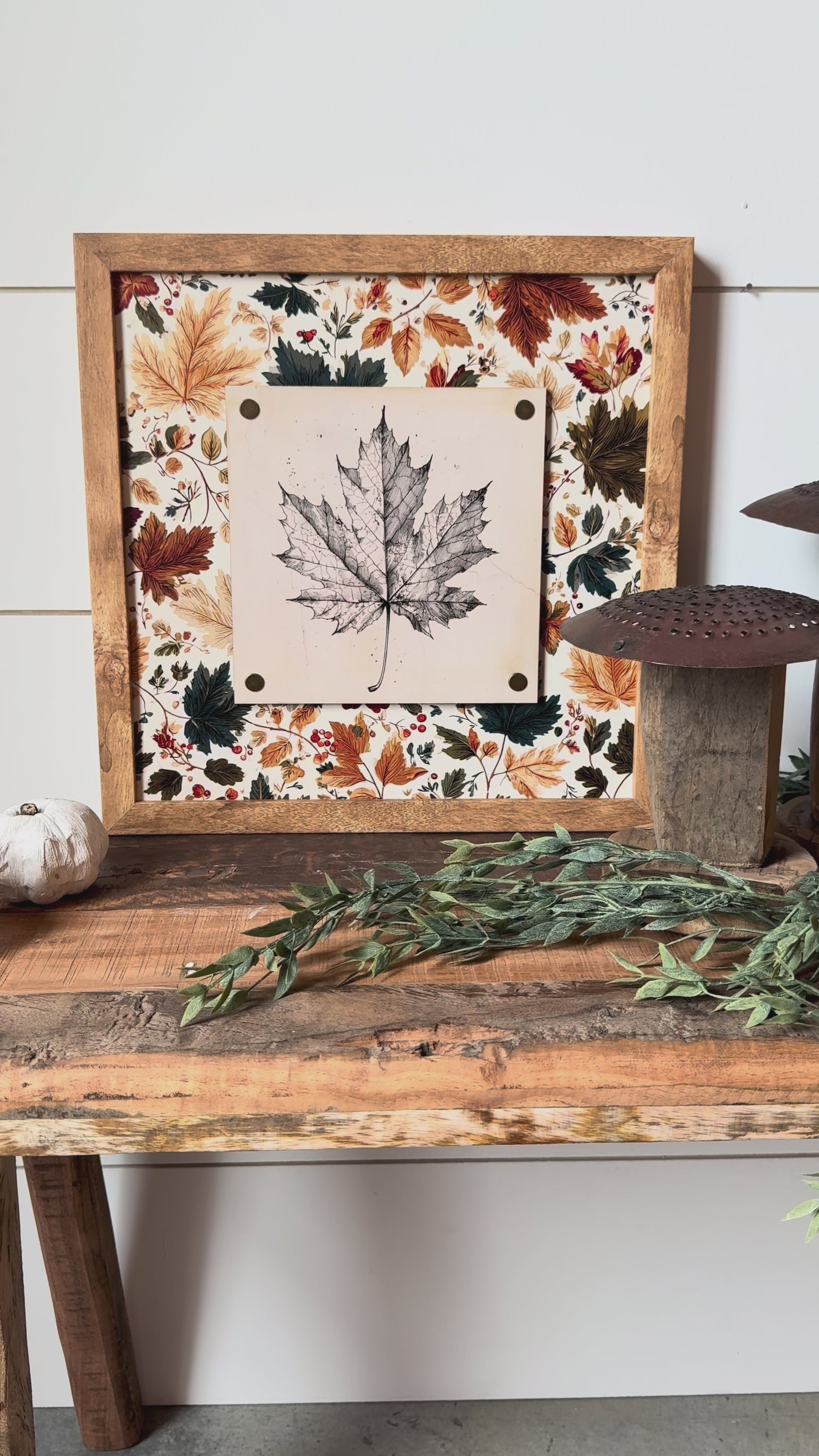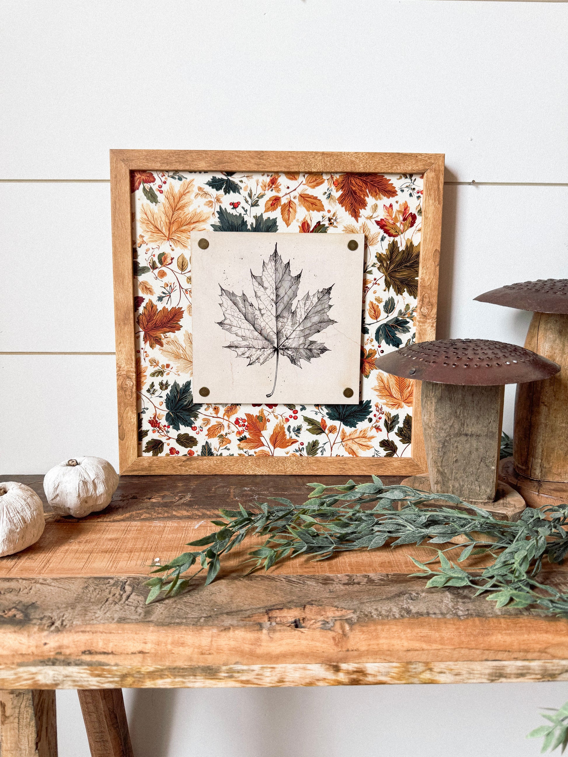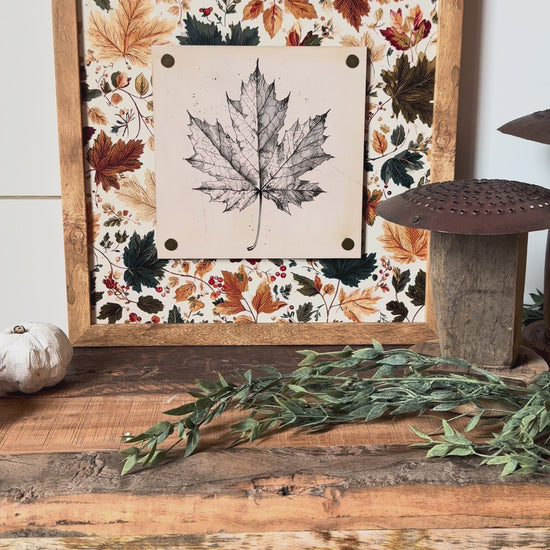 Handmade wooden sign with vintage fall leaf printed on wood plaque attached to sign with 4 vintage style nail pins in the corners. Each sign has a unique layered piece giving them an added dimension.