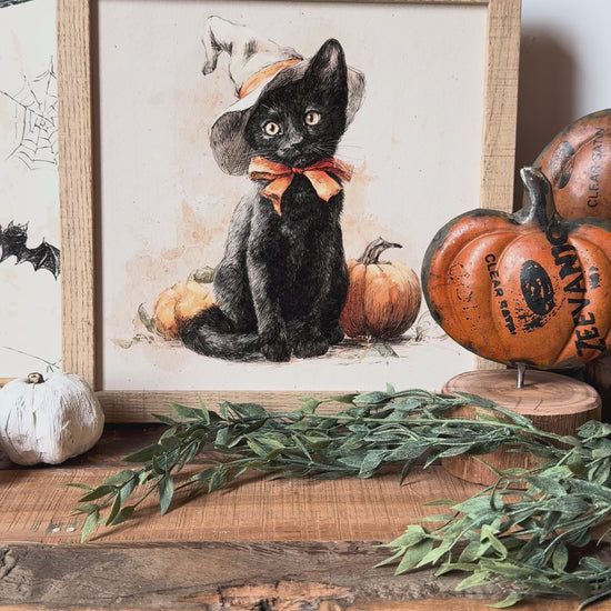 Handmade wooden sign with printed vintage black cat with witch hat. Perfect for layering on a shelf or mantel with your fall and halloween decor.