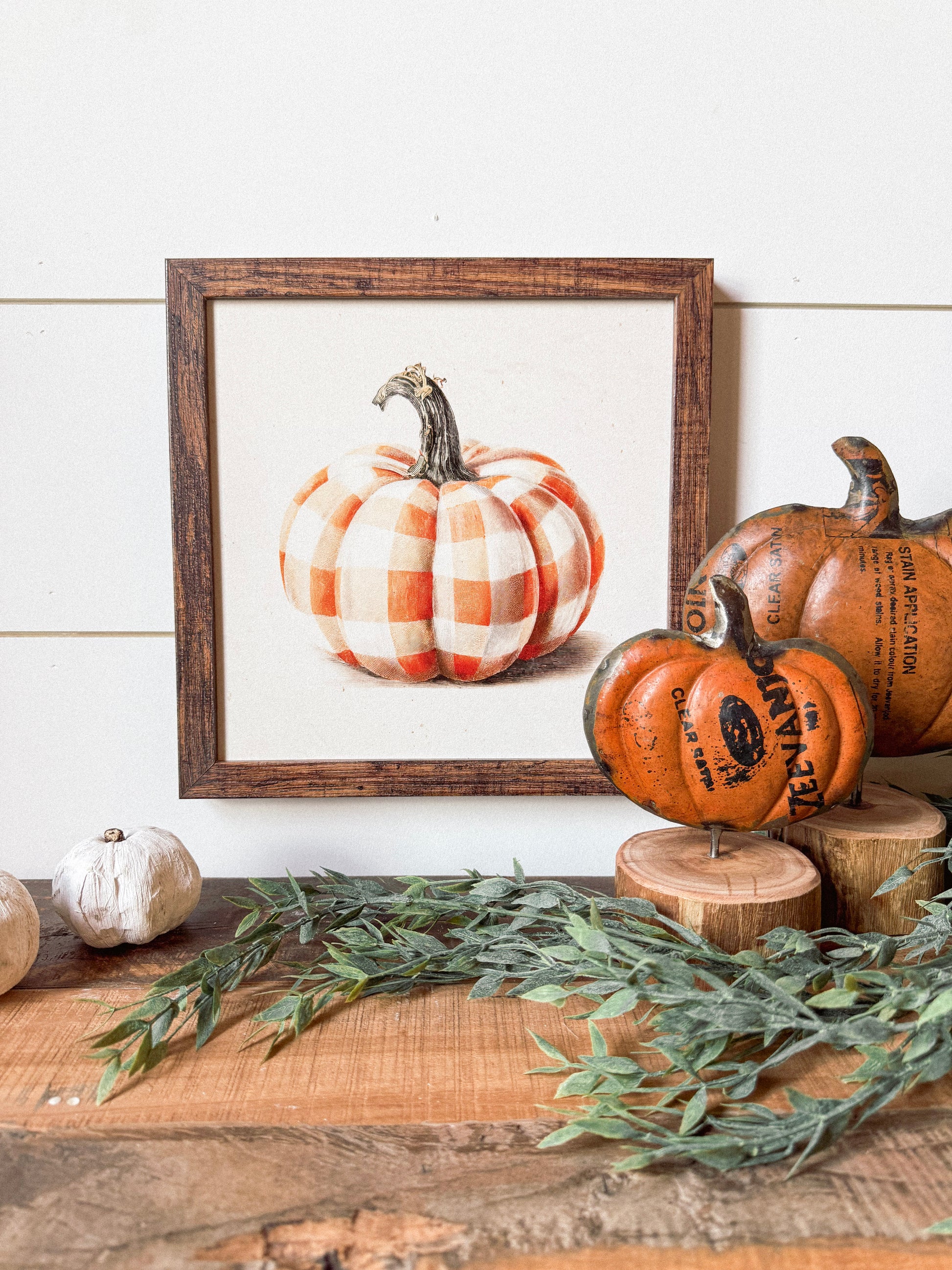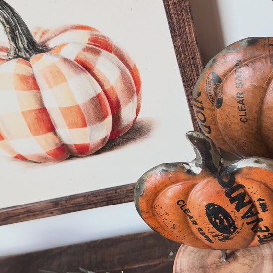 Handmade wooden sign with printed vintage style plaid pumpkin. Perfect for layering on a shelf or mantel with your fall and halloween decor.