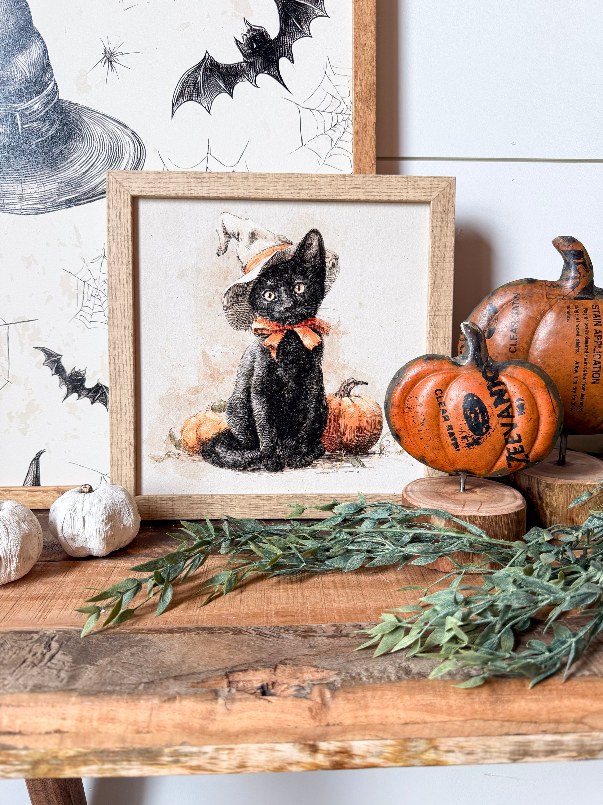 Handmade wooden sign with printed witch hat, cobweb and bat design, Perfect for layering on a shelf or mantel with your fall and halloween decor.