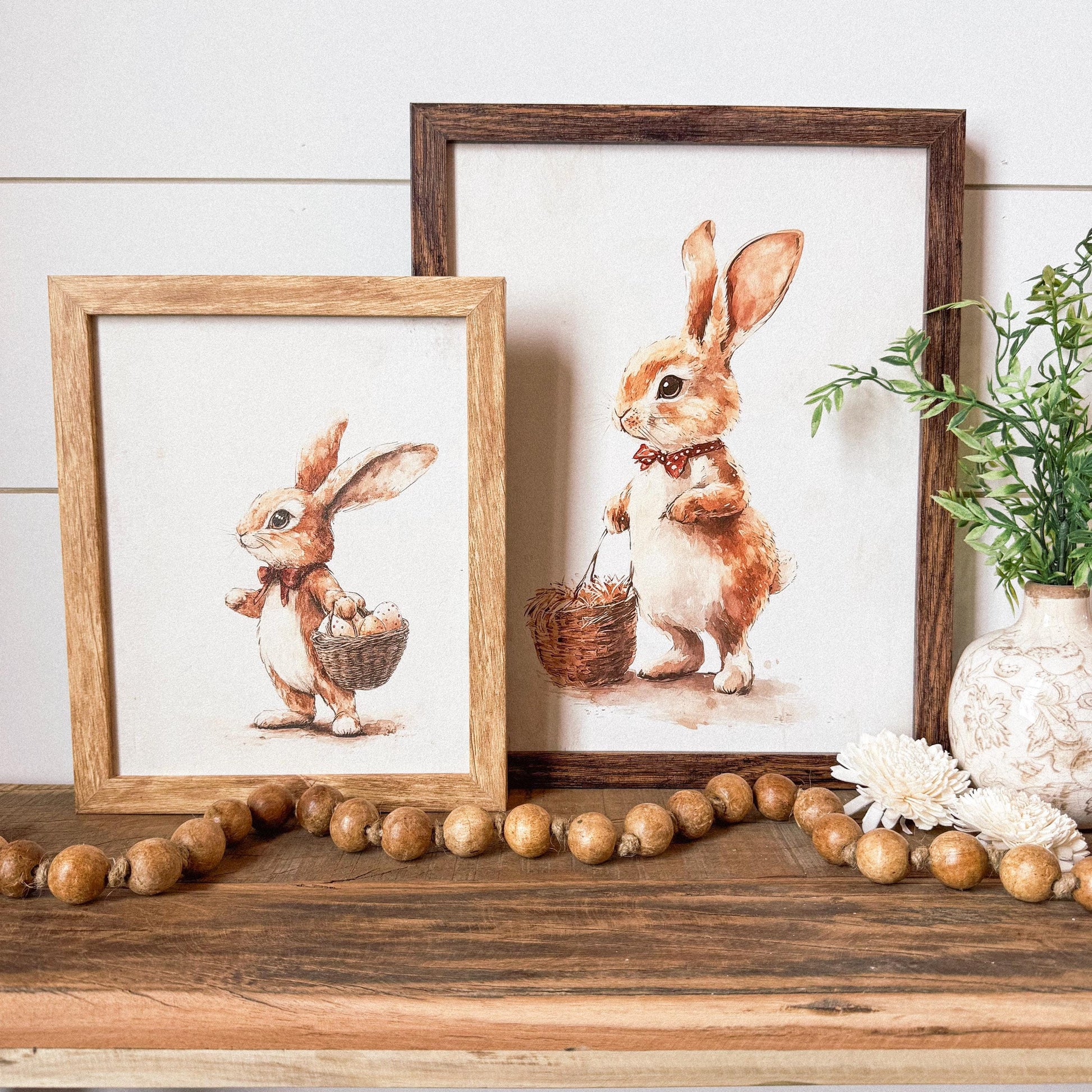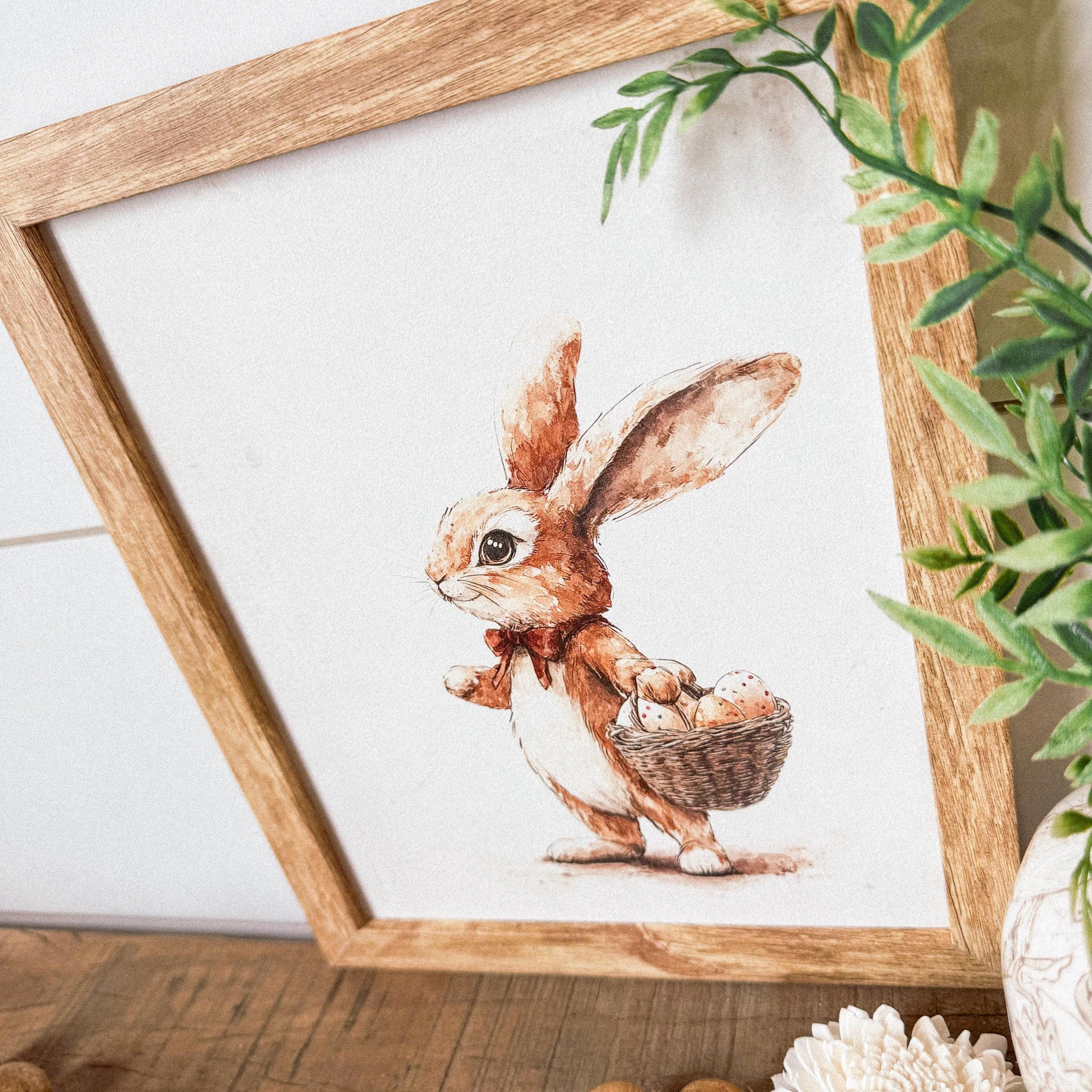 Handmade wooden sign with the cutest bunny with basket print, perfect for your Spring and Easter decor. Choose from two different bunny styles and printed directly on wood and framed in the frame color of your choice. Perfect for a statement piece or to add to a shelf.
