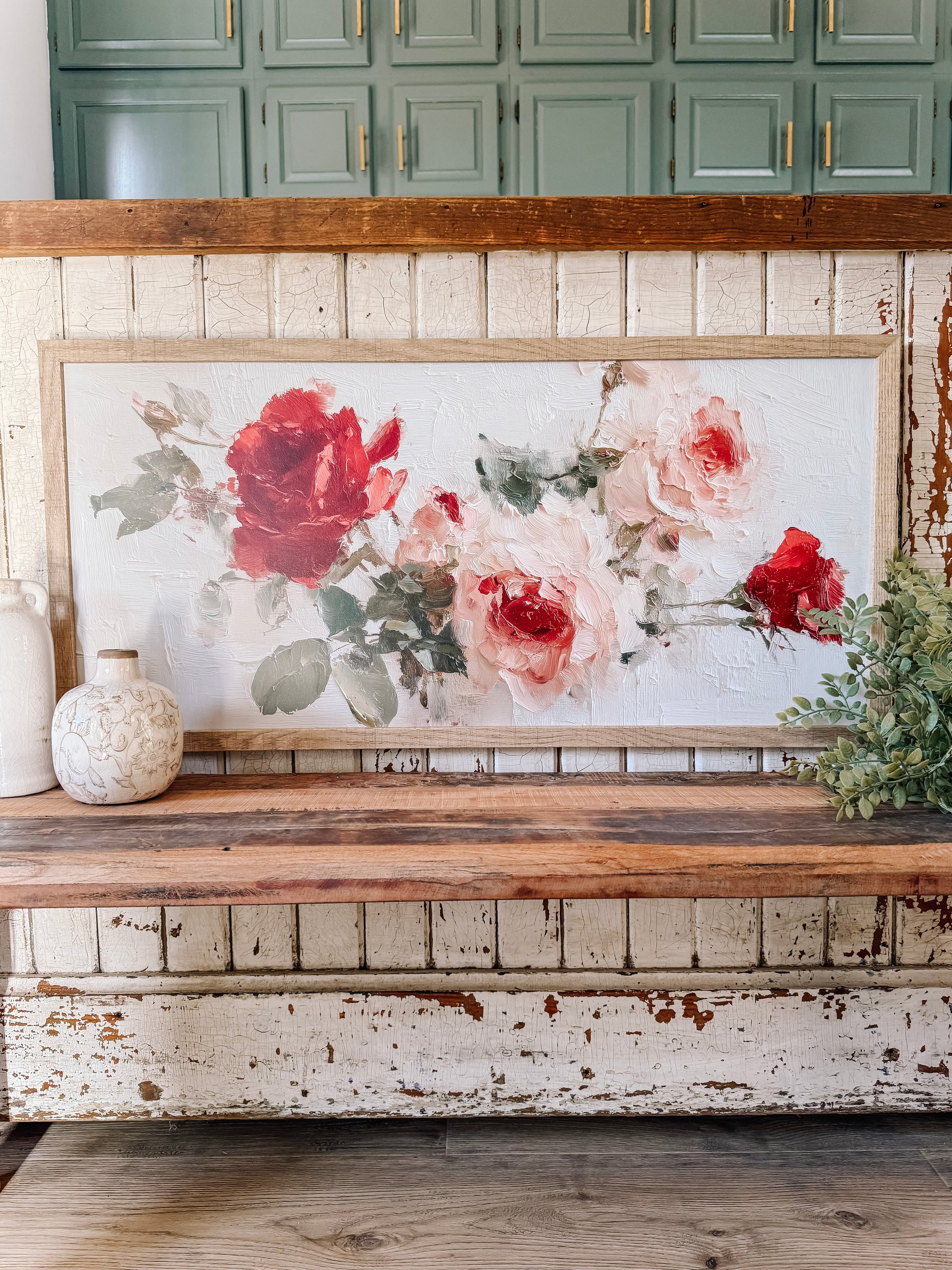 Handmade wooden farmhouse style sign with red and soft pink roses. Vintage style with textured look and printed directly on wood and framed in the frame color of your choice. Perfect for a statement piece or to add to a shelf.