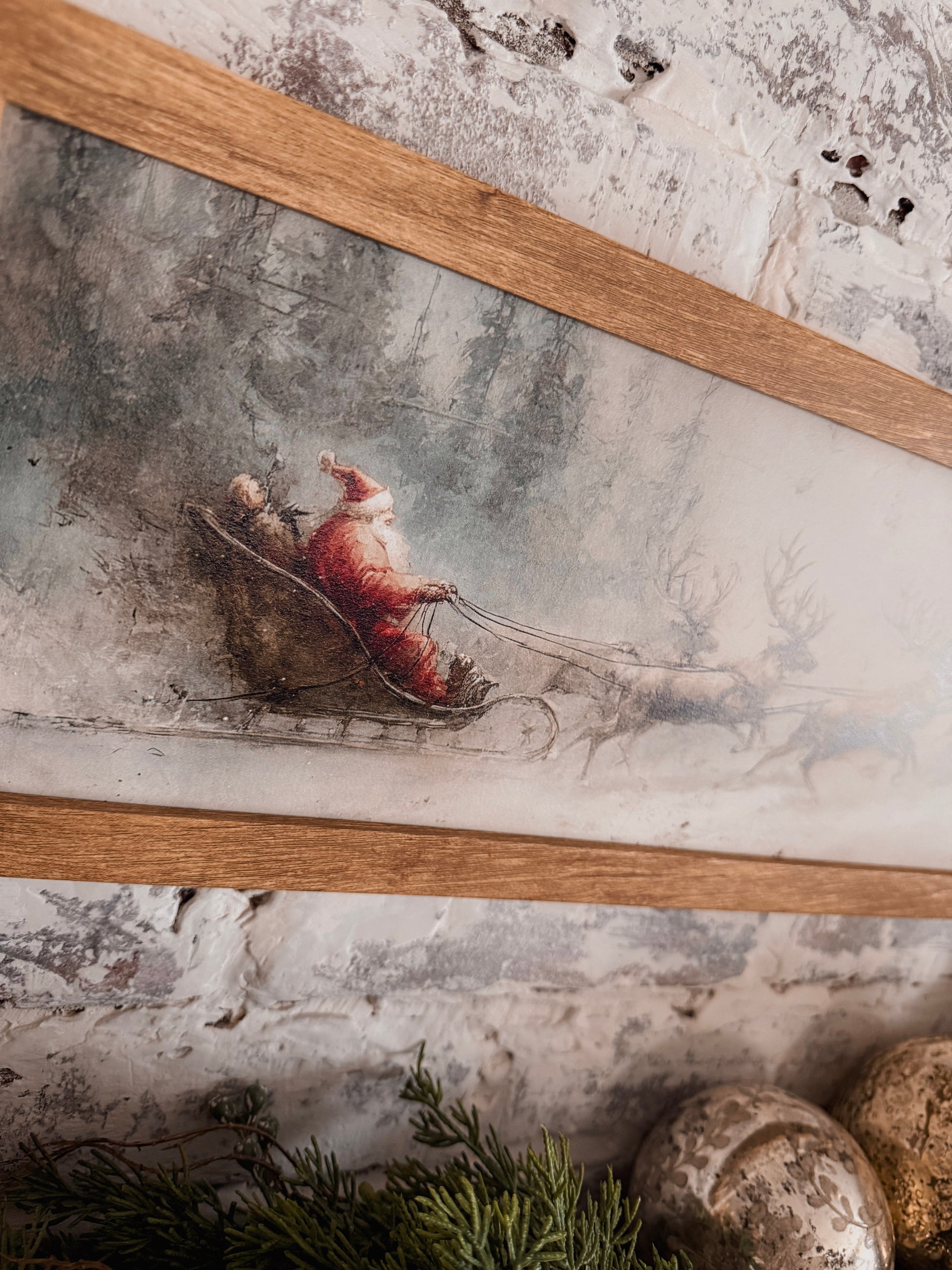 Handmade wooden sign with beautiful printed vintage Santa with Reindeer that has a gorgeous nostalgic feel to it. Beautiful vintage home decor for Christmas. Printed directly on wood and framed in the frame color of your choice. This is a perfect sign to layer with your other pieces and would go great on a mantel or shelf display!