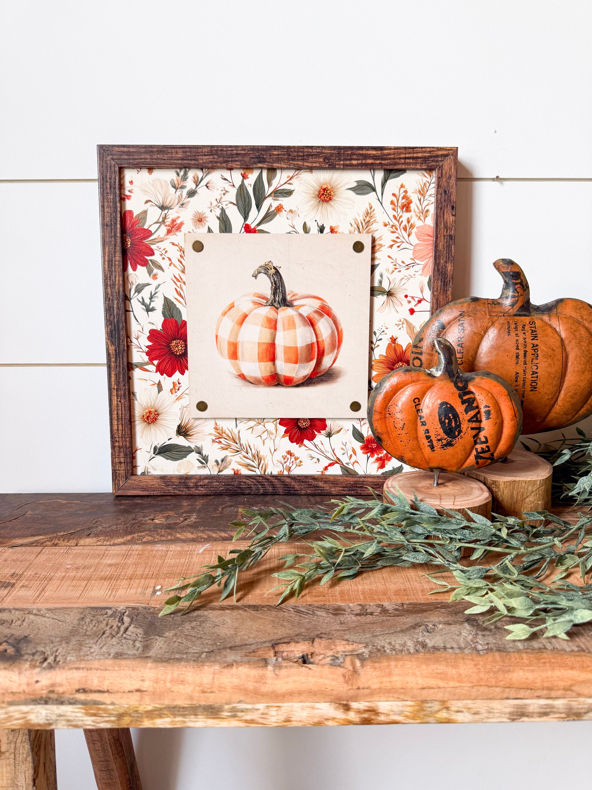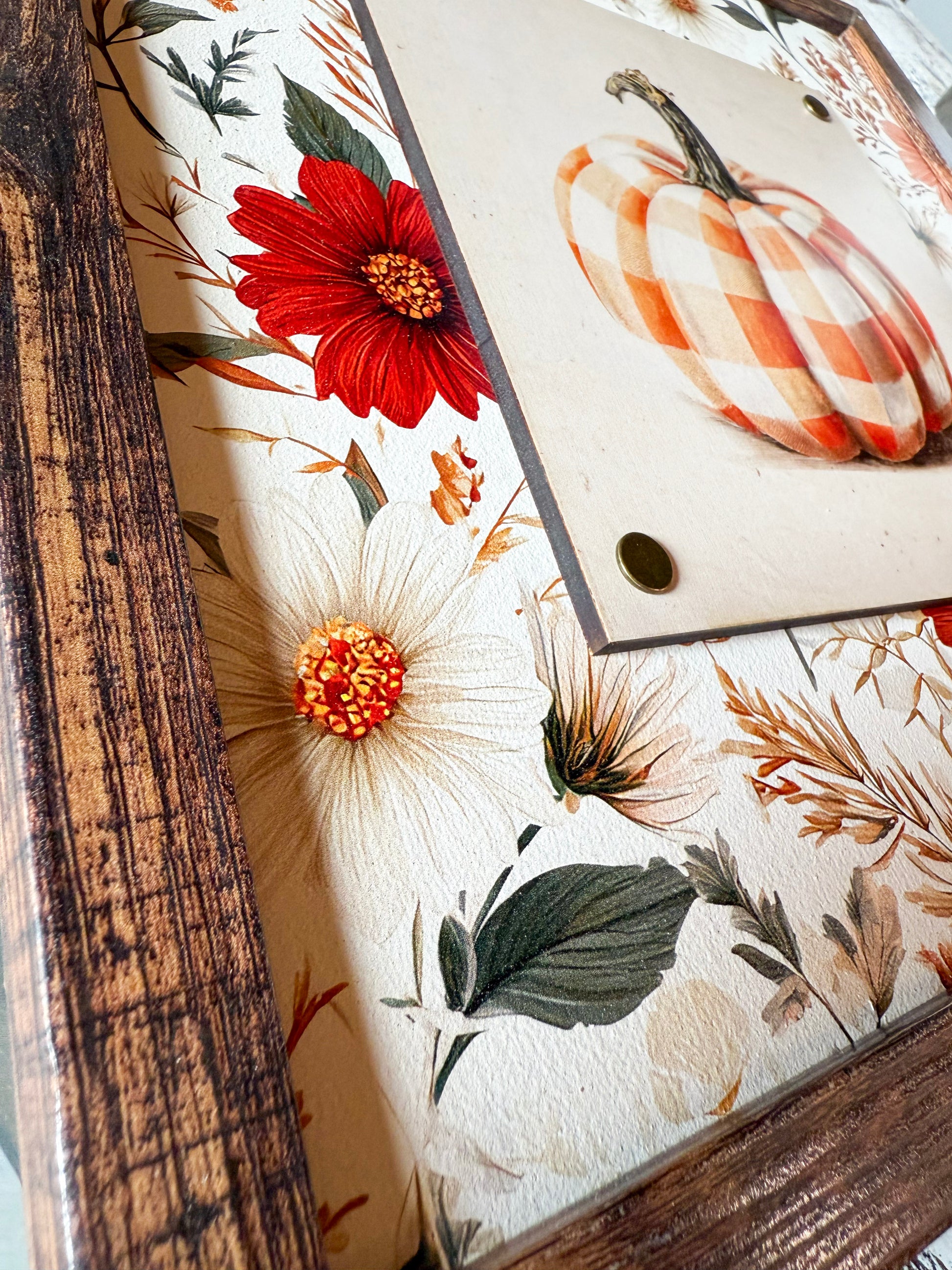 Handmade wooden sign with whimsical style plaid pumpkin printed on wood plaque attached to sign with 4 vintage style nail pins in the corners. Whimsical fall floral background. Each sign has a unique layered piece giving them an added dimension.