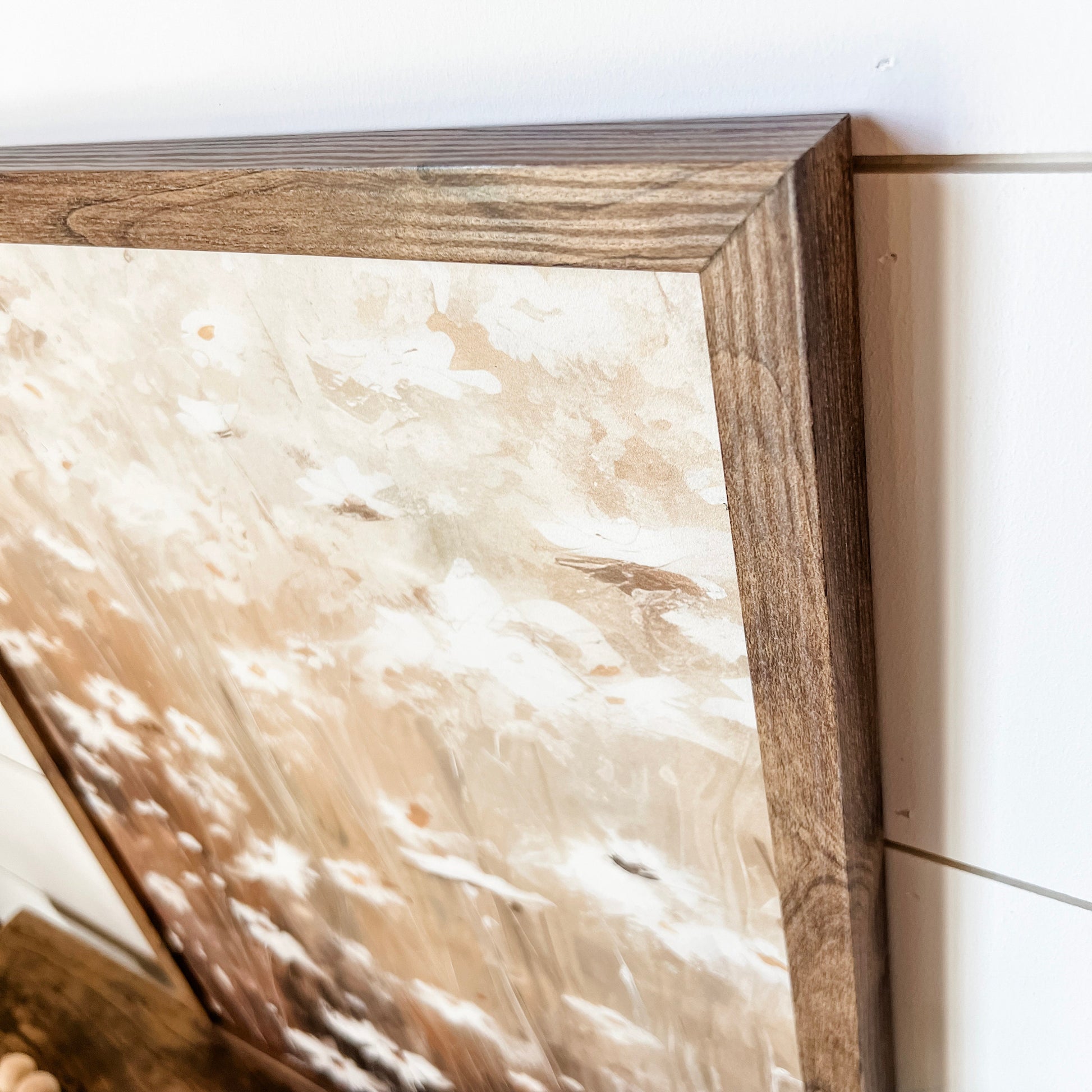 Handmade wooden sign with white daisies print. Vintage and warm in style and printed directly on wood and framed in the frame color of your choice. Perfect for a statement piece or to add to a shelf.