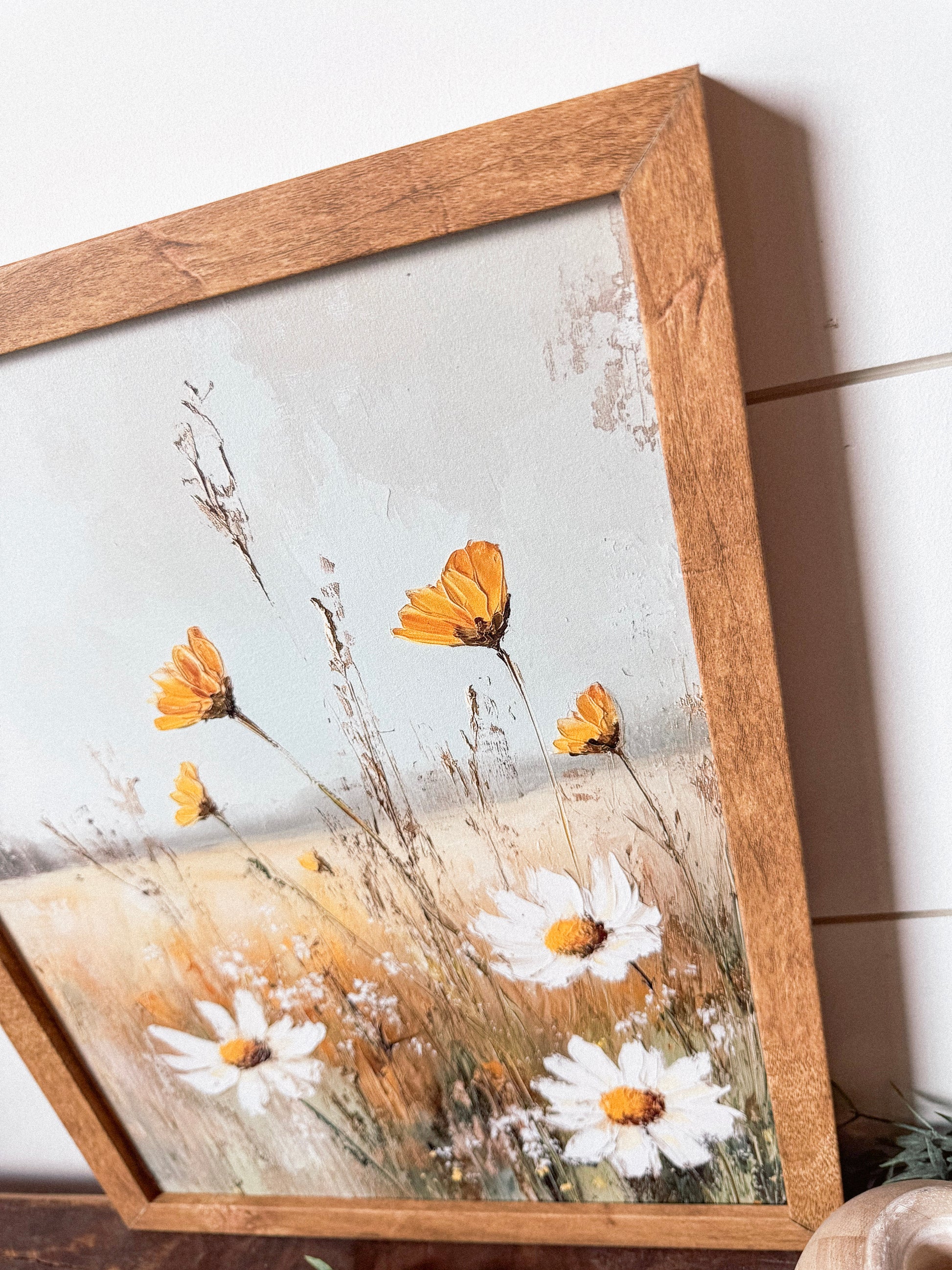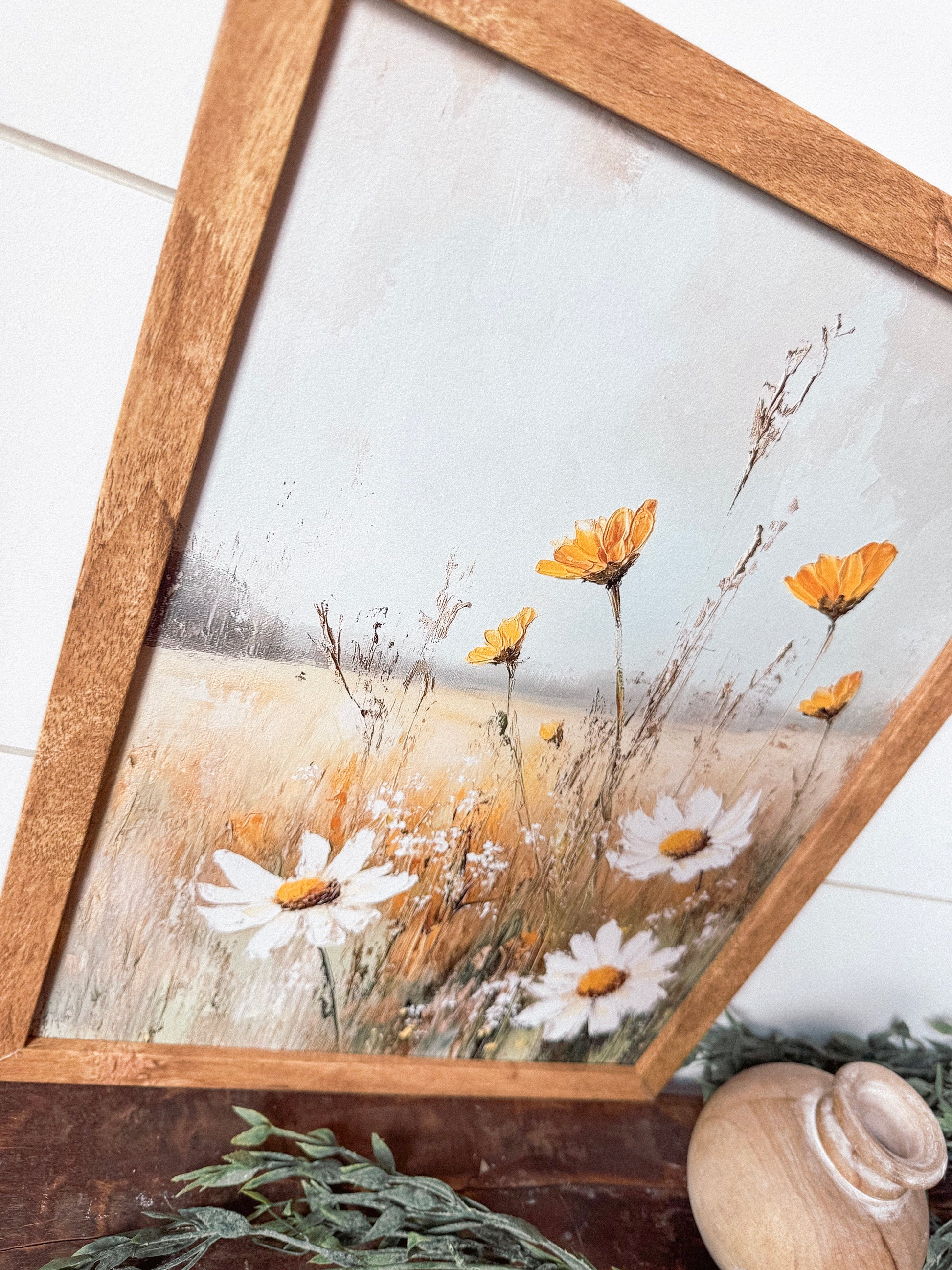 Handmade wooden vintage and rustic floral wood sign with yellow and white flowers in a field. Perfect for your every day decor. Printed directly on wood and framed in the frame color of your choice.